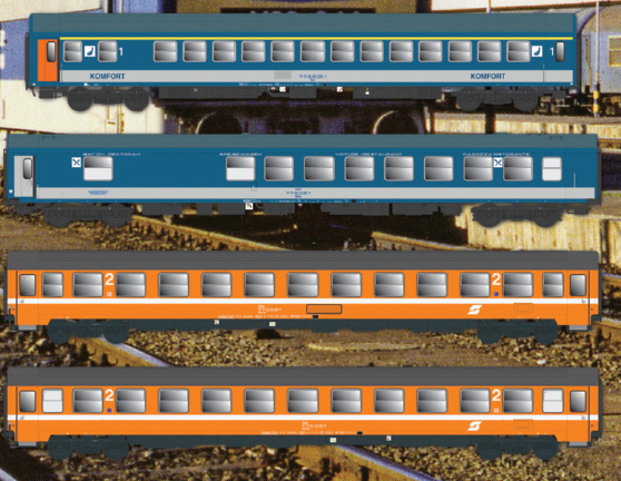 EuroCity Franz Lehar der MAV/ÖBB, Epoche V, bestehend aus einem Personenwagen 1. Klasse und einem Speisewagen der MAV und zwei Personenwagen 2. Klasse der ÖBB in oranger Farbgebung