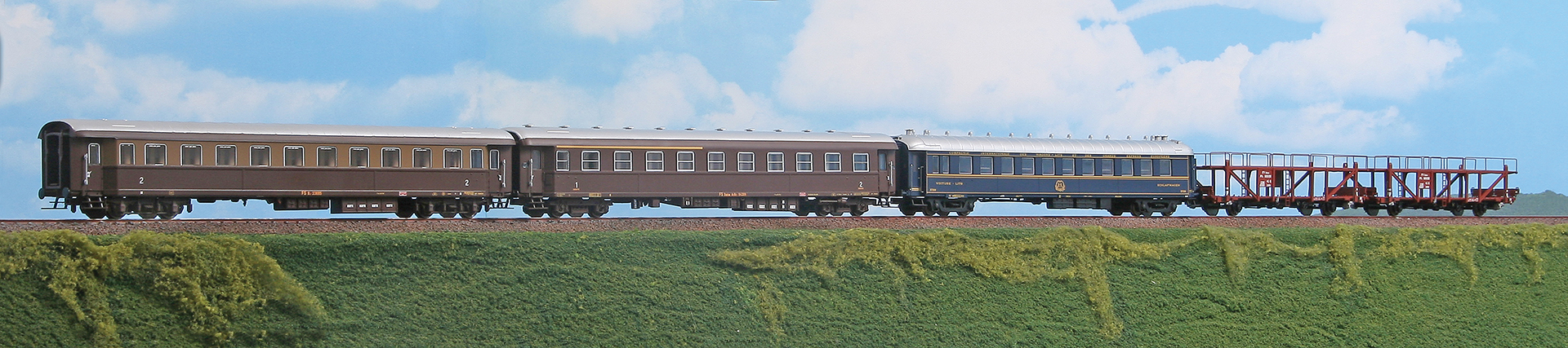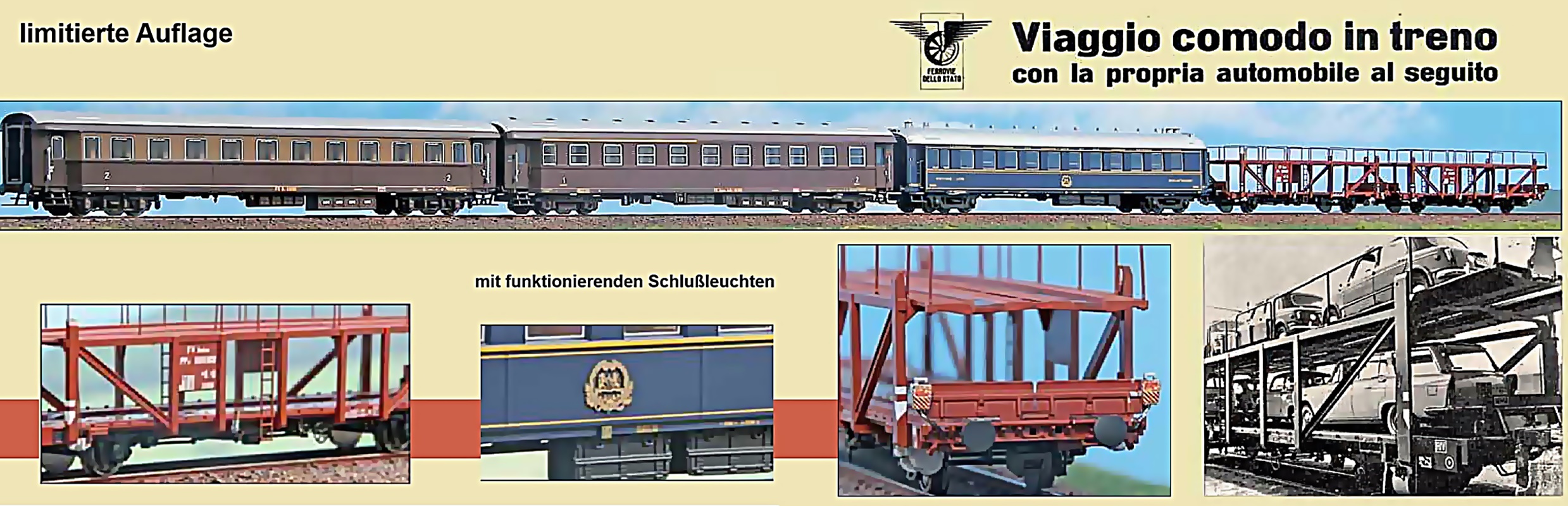 Langstrecken-Autoreisezug im Saisonbetrieb äLombardia-Puglia“ (LPS-PLS) der FS, Epoche III, bestehend aus einem 2. Klasse Wagen Typ 1946 in zweifarbigem Braun, einem gemischten Liegewagen in brauner Lackierung, einem CIWL-Schlafwagen Breda und zwei PP-Autotransporter wie sie Mitte der sechziger Jahre zu sehen waren. Limitierte Auflage
