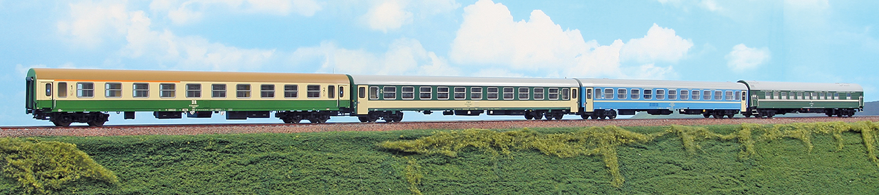 Hoek van Holland - Warszawa Express-Set bestehend aus einem DR-Wagen der 1/2-Klasse, einem PKP-Wagen der 2 Klasse, einem PKP-Liegewagen und einem SZD-Schlafwagen, für die Epoche 5.