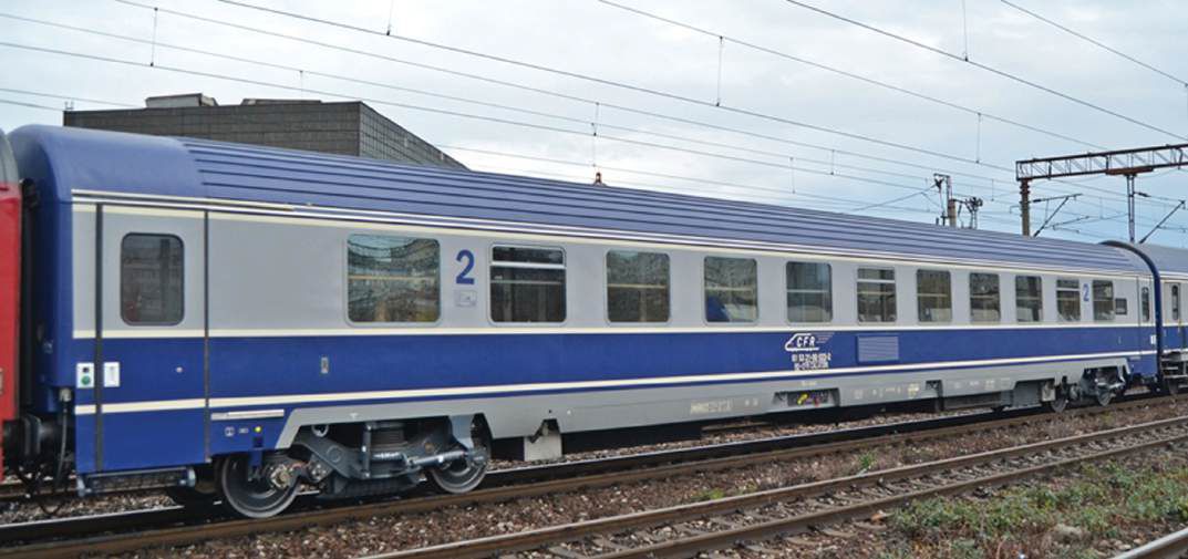 Generalüberholter Reisezugwagen des Typs AVA200, Baureihe 21-90, in der Lackierung EXPRESS des staatlichen Verkehrsunternehmens CFR Calatori, für die Epoche 6.
