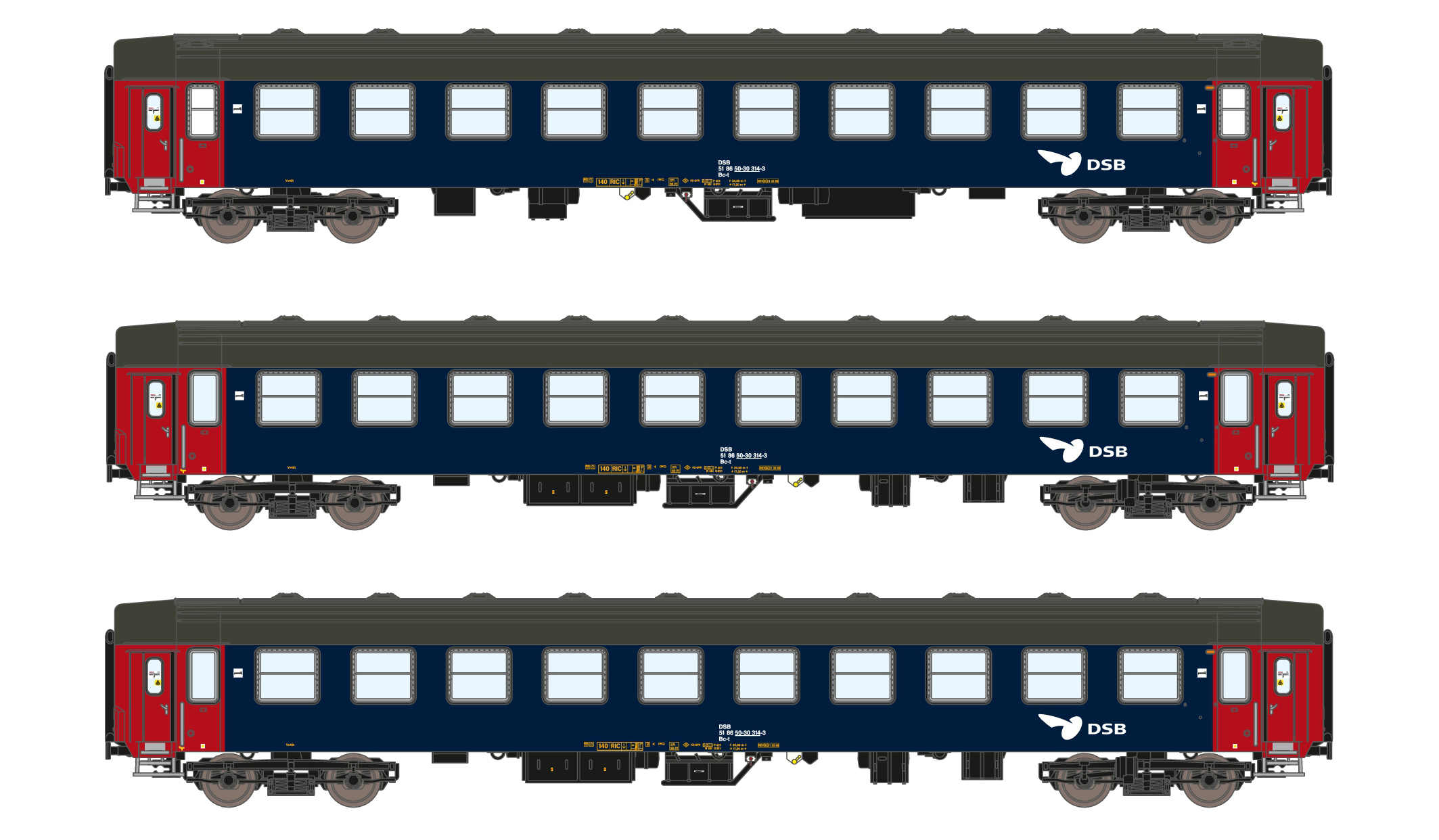 ASM bringt zunächst die Wagen 1. und 2. Klasse der DSB auf den Markt, gefolgt von den anderen Varianten. Sämtliche Modelle sind maßstabsgetreu dem Vorbild entsprechend und natürlich mit Kurzkupplungskulisse mit NEM-Kupplungsaufnahme ausgestattet. Die Wagen sind für den Einbau einer Innenbeleuchtung vorgesehen; die Stromabnahme erfolgt schleiferlos über Metalllagerpfannen an den Radlagern.