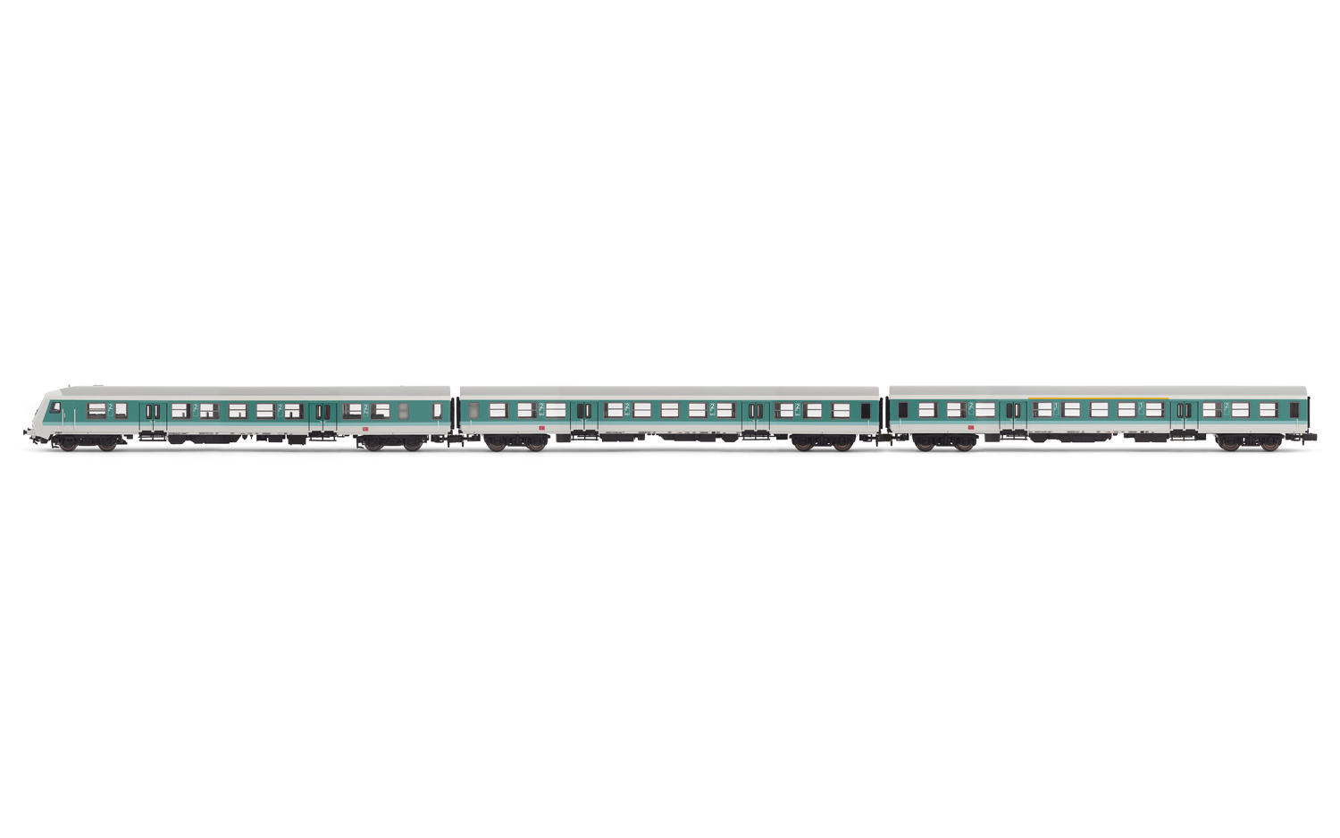 Nahverkerswagen-Set 3-teilig, bestehend aus 1x Steuerwagen, 1x 1./2. Klasse Wagen Aby und 1x 2. Klasse Wagen By, der DB AG in mintgrün/weißer Lackierung, für die Epoche 5.