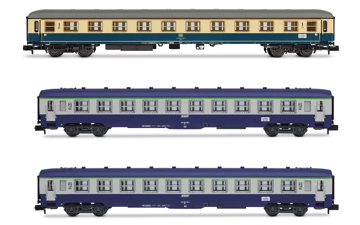3-unit pack of coaches ?D242 Paris ? Berlin ? Warszawa?, including 1 x DB coach Am in blue/beige livery and 2 x SNCF coaches DEV AO B10, ep. IV
