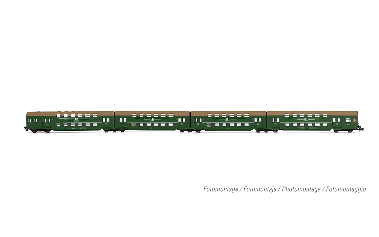 DR, set de 4 coches de doble piso, DBv con cabina de maquinista y frontal plano, decoración verde hoja/marrón ?DR?, ép. IV