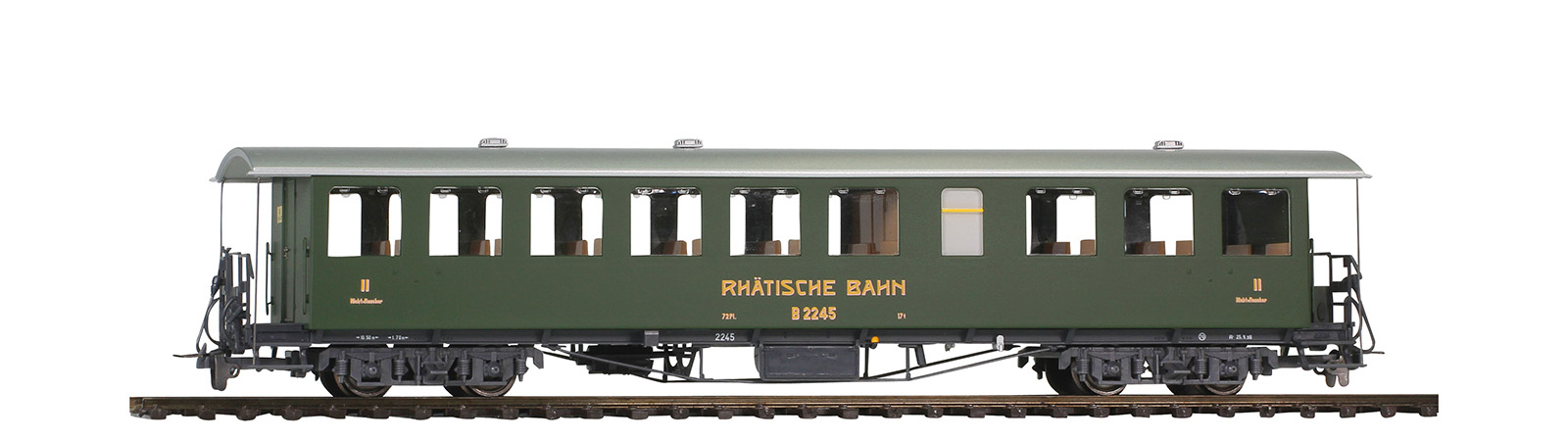 Die drei Drehgestell-Plattformwagen B 2245-2247 sind heute Bestandteil vieler RhB-Nostalgiezüge, ob hinter Dampfloks oder einer der Stangenelloks. 2018 waren sie unter anderem zwischen Mai und Oktober oft in den Nostalgie-Planzügen zwischen Davos und Filisur eingereiht. Die ab 1956 als B 2245-2249 bezeichneten Vierachser wurden 1928 für die Arosalinie beschafft und waren daher bis zur Aufarbeitung zum Nostalgiewagen mit einer Dachrutenkupplung bestückt. Ausführung der Wagenmodelle ohne Faltenbalge.