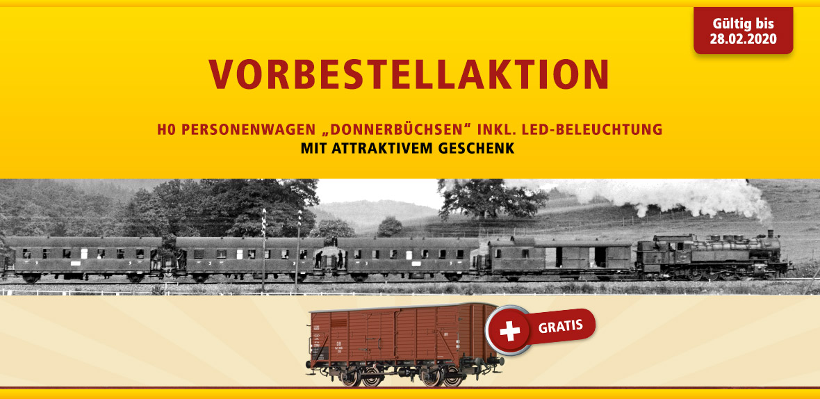 Bei Vorbestellung eines kompletten "Donnerbüchsen"-Zuges inkl. LED-Beleuchtung, bestehend aus einem Packwagen und drei bzw. vier Personenwagen, erhalten alle Käufer kostenlos den exklusiven Werkstattwagen G10, Epoche III der DRG bzw. DB im Wert von 39,90 UVP und damit einen Kostenvorteil bis zu 11 %. Die perfekte Ergänzung ? wie in vielen Vorbildszenen! Die Wagen der AC-Varianten werden ab Werk mit AC-Radsätzen ausgestattet.
