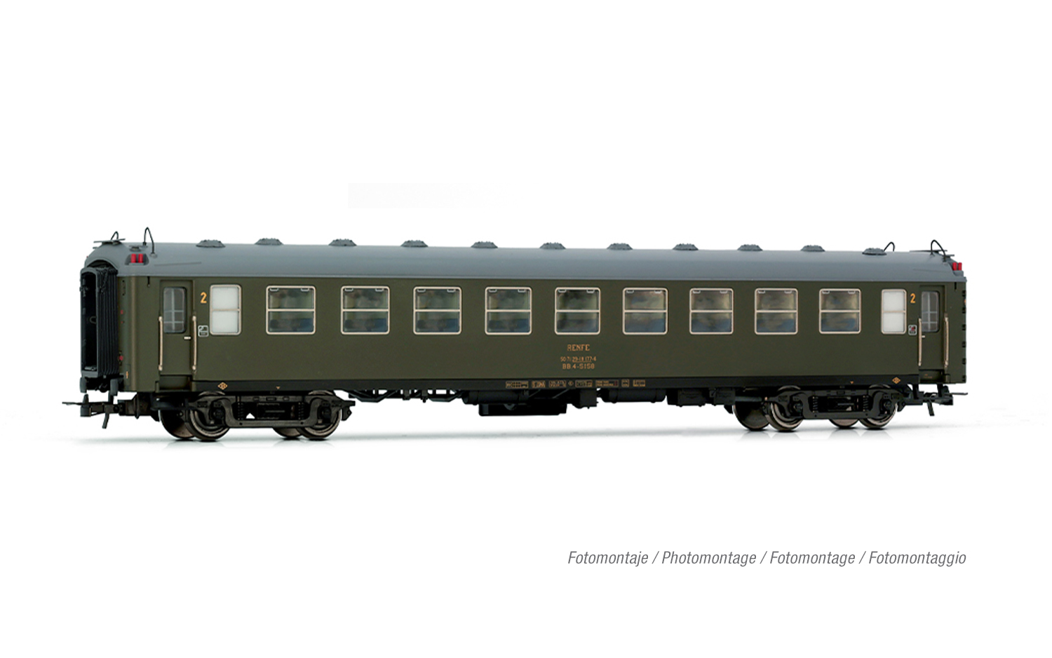 RENFE, 2-tlg. Set Reisezugwagen 5000 der Gattung BB4 2. Klasse, mit Faltenbälgen, olivgrüne Farbgebung, Ep. IV