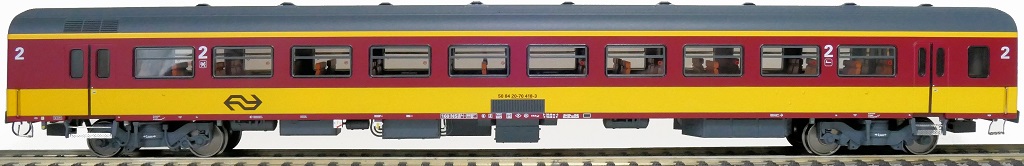 NS ICR (Originalversion) für den Beneluxzug nach Belgien Reisezugwagen B 2. Klasse ( Farbe Gelb / Rot) Epoche IV mit Beleuchtung und Figuren.