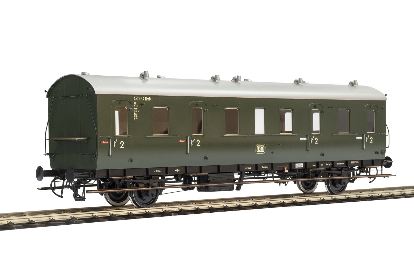 3./3. Klasse, Wagenkasten RAL 6007 Es werden 3 verschiedene Wagennummern aufgelegt. A,B,C hinter der Artikelnummer Handgefertigtes Präzisionsmodell aus Messing mit original Schraubkupplungen, austauschbar gegen Funktionskupplungen, kinematische Kurzkupplung mit Kulissenführung für vorbildgerecht enggekuppelten Betrieb, Federpuffer, kugelgelagerte und gefederte Achsen, detaillierte Inneneinrichtung, komplette Detaillierung des Wagenunterbodens und der Bremsanlage, schaltbare Innenbeleuchtung inklusive Funktionsdecoder mit Strompuffer für flackerfreien Betrieb, Türen nicht zum Öffnen, vorbildgerecht beidseitig profilierte Räder. LüP ca. 30,9 cm, Gewicht ca. 1 kg, Mindestradius 910 mm.