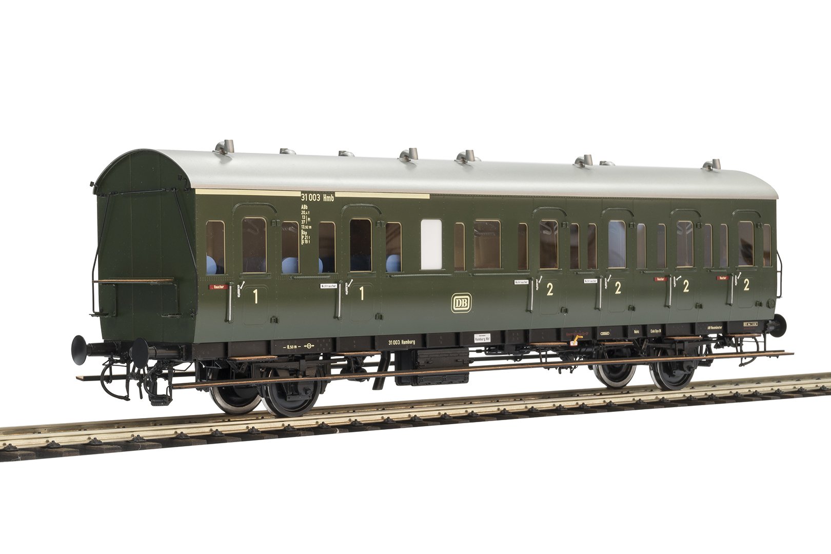 1./2. Klasse, Wagenkasten RAL 6007 Es werden 2 verschiedene Wagennummern aufgelegt. A,B hinter der Artikelnummer Handgefertigtes Präzisionsmodell aus Messing mit original Schraubkupplungen, austauschbar gegen Funktionskupplungen, kinematische Kurzkupplung mit Kulissenführung für vorbildgerecht enggekuppelten Betrieb, Federpuffer, kugelgelagerte und gefederte Achsen, detaillierte Inneneinrichtung, komplette Detaillierung des Wagenunterbodens und der Bremsanlage, schaltbare Innenbeleuchtung inklusive Funktionsdecoder mit Strompuffer für flackerfreien Betrieb, Türen nicht zum Öffnen, vorbildgerecht beidseitig profilierte Räder. LüP ca. 30,9 cm, Gewicht ca. 1 kg, Mindestradius 910 mm.
