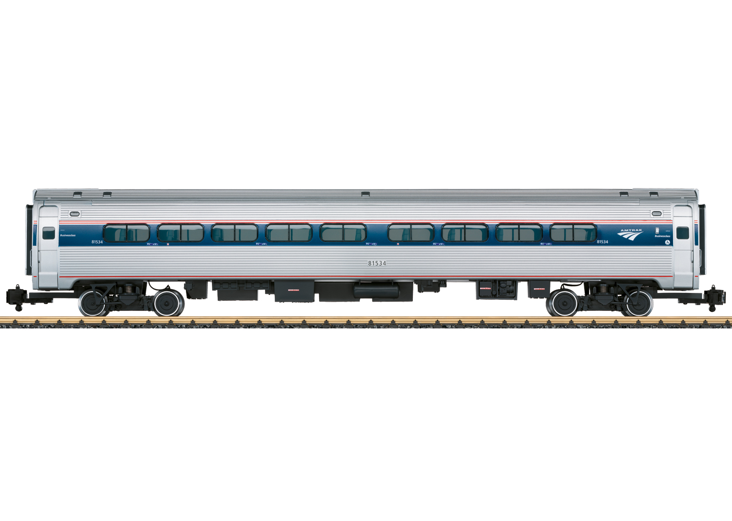 Amfleet® Personenwagen Modell eines Personenwagens der Bauart Amfleet der amerikanischen Personenverkehrsgesellschaft Amtrak, Ausführung als Wagen der Businessclass. Farbgebung und Beschriftung sind vorbildgerecht für Epoche VI. Serienmäßig ausgestattet mit kompletter Inneneinrichtung und Innenbeleuchtung mit LED. Metallradsätze, davon 2 Kugellagerradsätze zur Stromabnahme. Ab Werk ausgerüstet mit US-Klauenkupplungen, LGB-Systemkupplungen liegen bei.Länge 80 cm. Schon bald nach der Gründung der Amtrak im Jahre 1971 machte sich bemerkbar, dass keine zeitgemäßen Personenwagen vorhanden waren – stammten doch die meisten aus den 1950er- und 1960er-Jahren. So wurden neue Intercity-Wagen bei der Firma Budd bestellt, die im Grunde auf den Metroliner-Triebzügen der Penn Central basierten, allerdings keinen Antrieb hatten, sondern von Lokomotiven gezogen wurden. So entstanden in den Jahren 1975 bis 1977 insgesamt 492 dieser 26 Meter langen und rund 50 Tonnen schweren Fahrzeuge, die – je nach Ausführung – bis zu 84 Sitzplätze in Großräumen haben. Die Höchstgeschwindigkeit beträgt zwar 200 m/h, kann aber nur auf wenigen Strecken – vor allem auf dem 750 km langen Nordost-Korridor von Washington über Philadelphia und New York nach Boston ausgefahren werden. Es gibt verschiedene Typen wie Business Class, normale Sitzwagen, Speisewagen oder auch Clubwagen. Selbst mit Schlafwagen wurde experimentiert, das wurde aber nicht weiterverfolgt. Nach dem Erfolg dieser Wagen wurden weitere 150 Stück geliefert, intern als äAmfleet II“ bezeichnet. Diese unterscheiden sich von den Vorgängern dadurch, dass sie nur an einem Wagenende Einstiegstüren und etwas größere Fenster haben. Auch heute noch sind diese Wagen – wenn auch mehrfach umgebaut und modernisiert – im Einsatz, vor allem auf kürzeren Strecken im Osten und mittleren Westen der USA. Die langen interkontinentalen Schnellzüge sind fest in der Hand der doppelstöckigen Superliner … Die dazu passenden Loks sind unter den Nummern 20493 und 20494 erhältlich. Mit den weiteren neuen Amfleet-Wagen der Amtrak kann ein typischer Schnellzug der Epoche VI - z.B. der berühmte City of New Orleans gebildet werden. Farbgebung in der Phase VI der Amtrak.Metallradsätze.Inneneinrichtung.Innenbeleuchtung mit Leuchtdioden.Weitere Wagennummern als Sticker beigelegt. Metallradsätze und Innenbeleuchtung mit LEDs