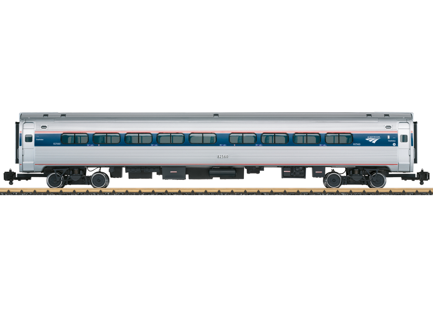 Amfleet® Personenwagen Modell eines Personenwagens der Bauart Amfleet der amerikanischen Personenverkehrsgesellschaft Amtrak, Ausführung als Wagen der Coachclass. Farbgebung und Beschriftung entsprechend der Epoche VI. Serienmäßig ausgestattet mit kompletter Inneneinrichtung und Innenbeleuchtung mit LEDs. Metallradsätze, davon 2 Kugellagerradsätze zur Stromabnahme. Ab Werk ausgerüstet mit US-Klauenkupplungen, LGB-Systemkupplungen liegen bei.Länge 80 cm. Die dazu passenden Loks sind unter den Nummern 20493 und 20494 erhältlich. Mit den weiteren neuen Amfleet-Wagen der Amtrak kann ein typischer Schnellzug der Epoche VI - z.B. der berühmte City of New Orleans gebildet werden. Farbgebung in der Phase VI der Amtrak.Metallradsätze.Inneneinrichtung.Innenbeleuchtung mit Leuchtdioden.Weitere Wagennummern als Sticker beigelegt. Metallradsätze und Innenbeleuchtung mit LEDs