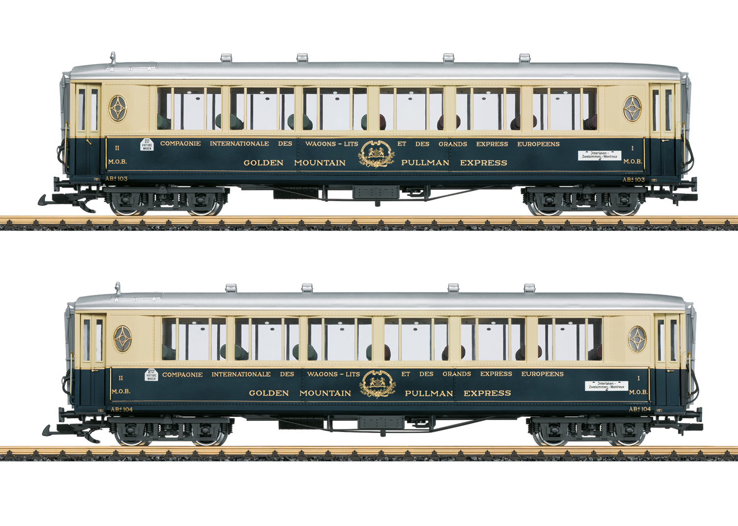 Personenwagen-Set bestehend aus zwei Wagen des "Golden Mountain Pullman Express" der CIWL, wie sie bei der MOB in den 1930er-Jahren im Einsatz waren. Originalgetreue Farbgebung und Beschriftung der Epoche II. Detaillierte Inneneinrichtung, Innenbeleuchtung serienmäßig eingebaut. Türen zum Öffnen. Metallradsätze. Länge über Puffer je Wagen 66 cm. Passend zur Lok L26662 und den Wagen L36661.