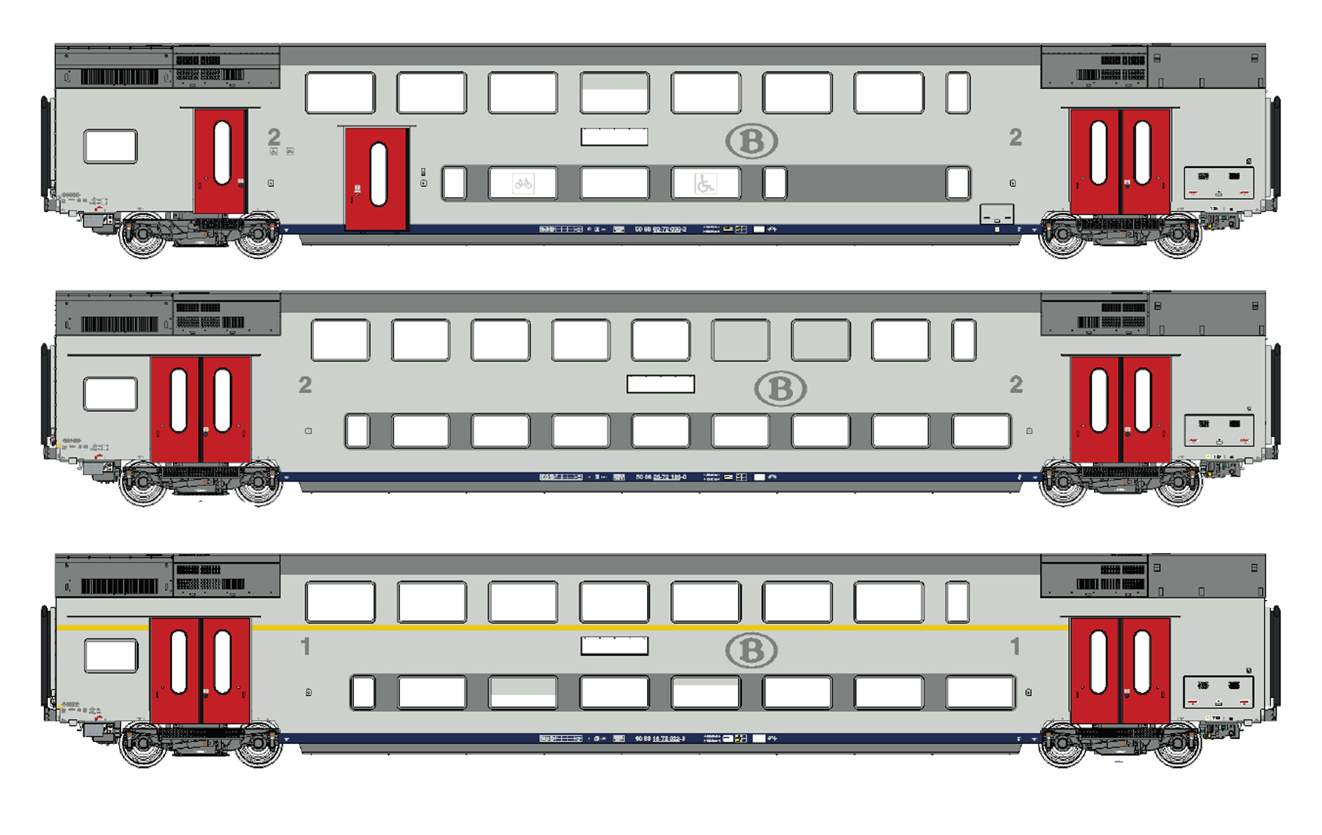 Doppelstockwagen-Set 3-teilig Typ M6 BD+B+A der SNCB, für die Epoche 6.