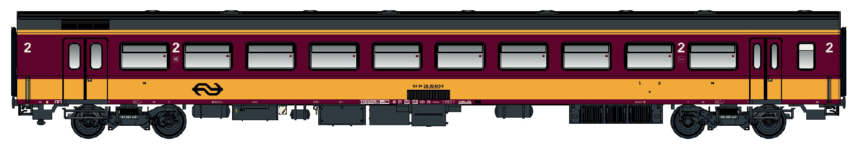 Reisezugwagen ICR B10 2. Klasse ohne Klimaanlage, der NS für den Benelux Verkehr, Farbgebung bordeauxrot/gelb, für die Epoche 4/5.
