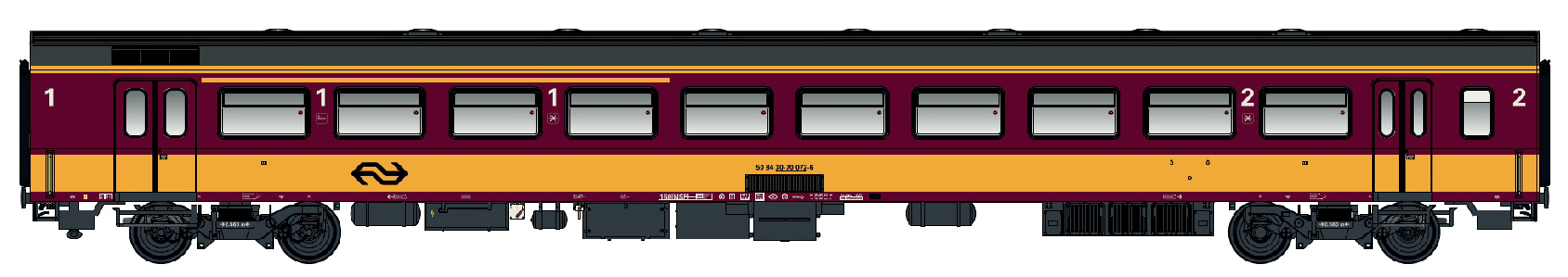 Reisezugwagen ICR A4B6 1./2. Klasse ohne Klimaanlage, der NS für den Benelux Verkehr, Farbgebung bordeauxrot/gelb, für die Epoche 4/5.