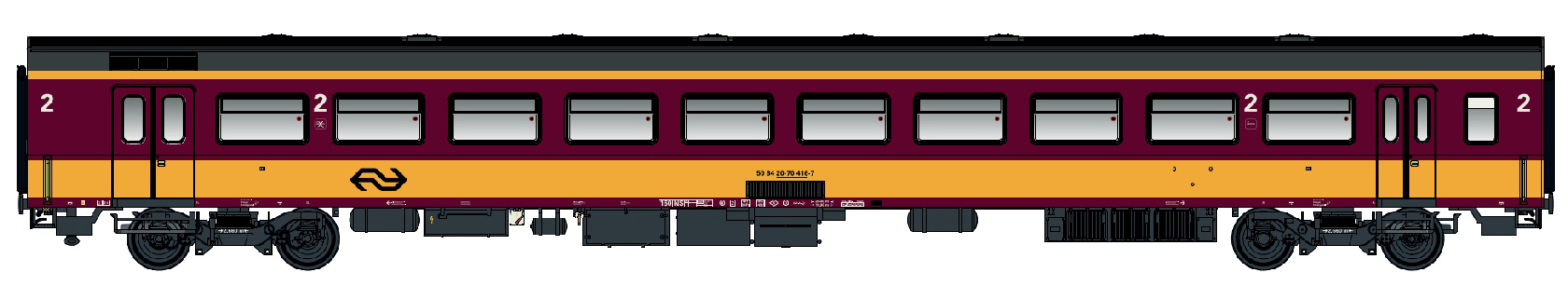 Reisezugwagen ICR B10 2. Klasse ohne Klimaanlage, der NS für den Benelux Verkehr, Farbgebung bordeauxrot/gelb, für die Epoche 4/5.