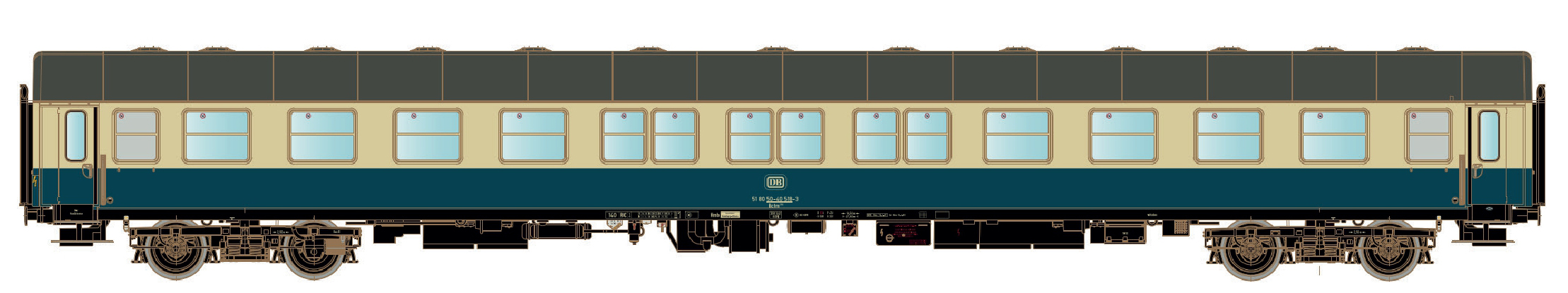 DB Bctm 256 Liegewagen, oceanblau/Elfenbein mit Klotzbremsen, für die Epoche 4.