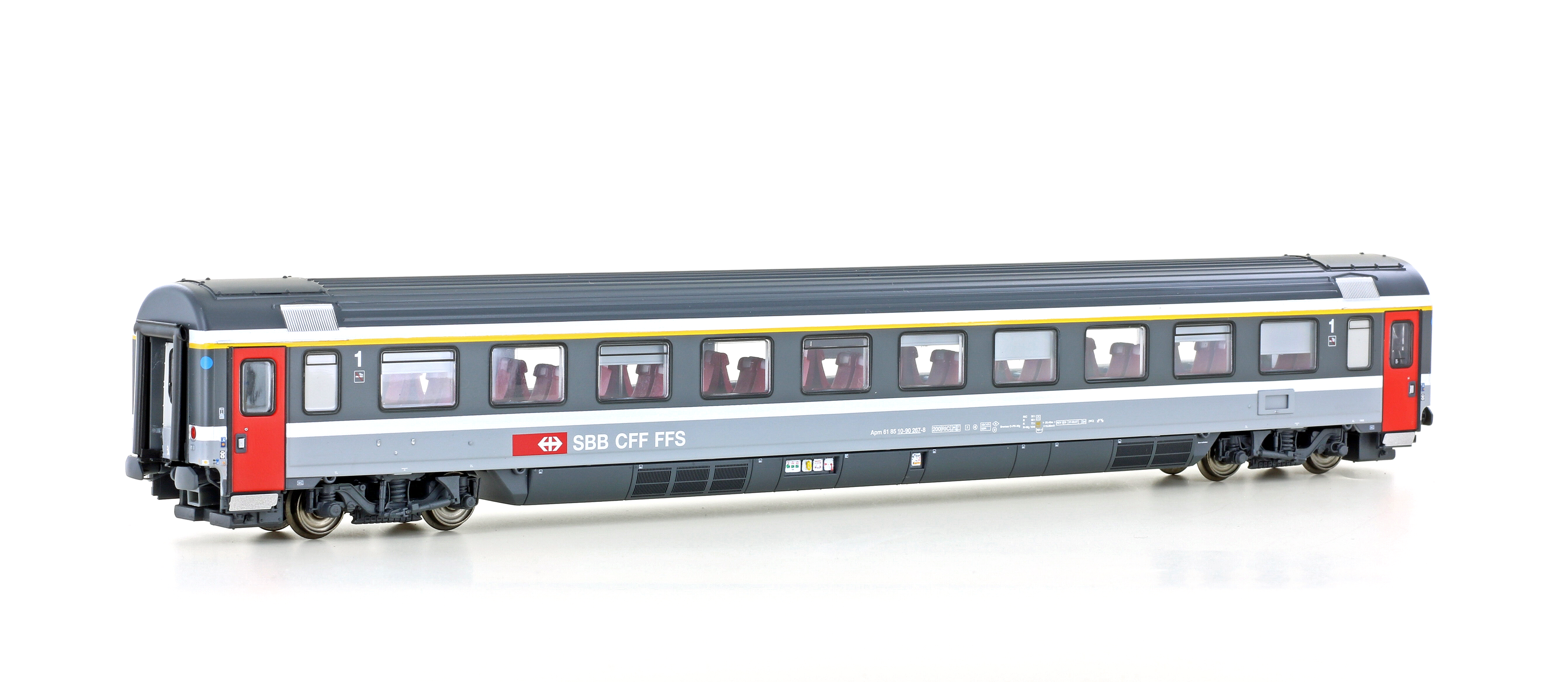 EC Personenwagen 1. Klasse der Bauart Apm der SBB für die Epoche 5, in dunkel/hellgrauer Farbgebung mit weißen Streifen und roten Türen, Nichtraucher.
