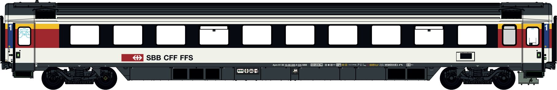 SBB EC Reisezugwagen Apm, 1. Klasse, Nichtraucher, Zielanzeigen, Lüftungsgitter, für die Epoche 6.