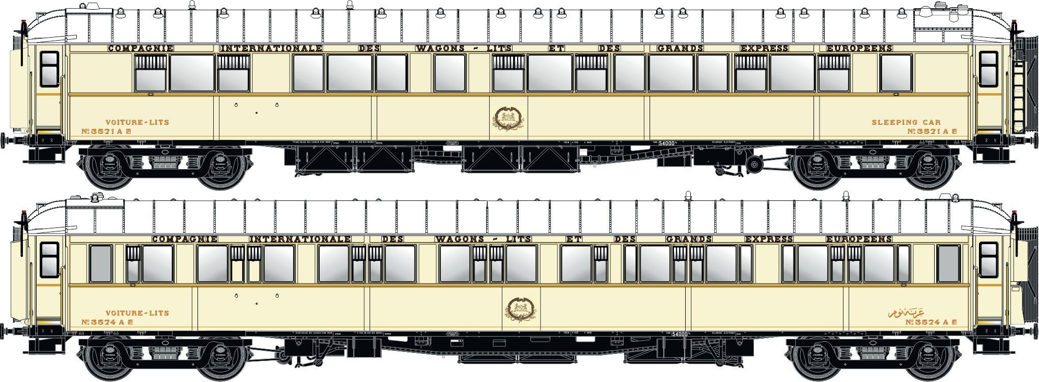 2-teiliges Schlafwagen-Set Typ WL S1 mit langem Untergestell und Dach englischer Bauform für den Einsatz in Ägypten, z.B. im Sunshine-Pullman-Express.