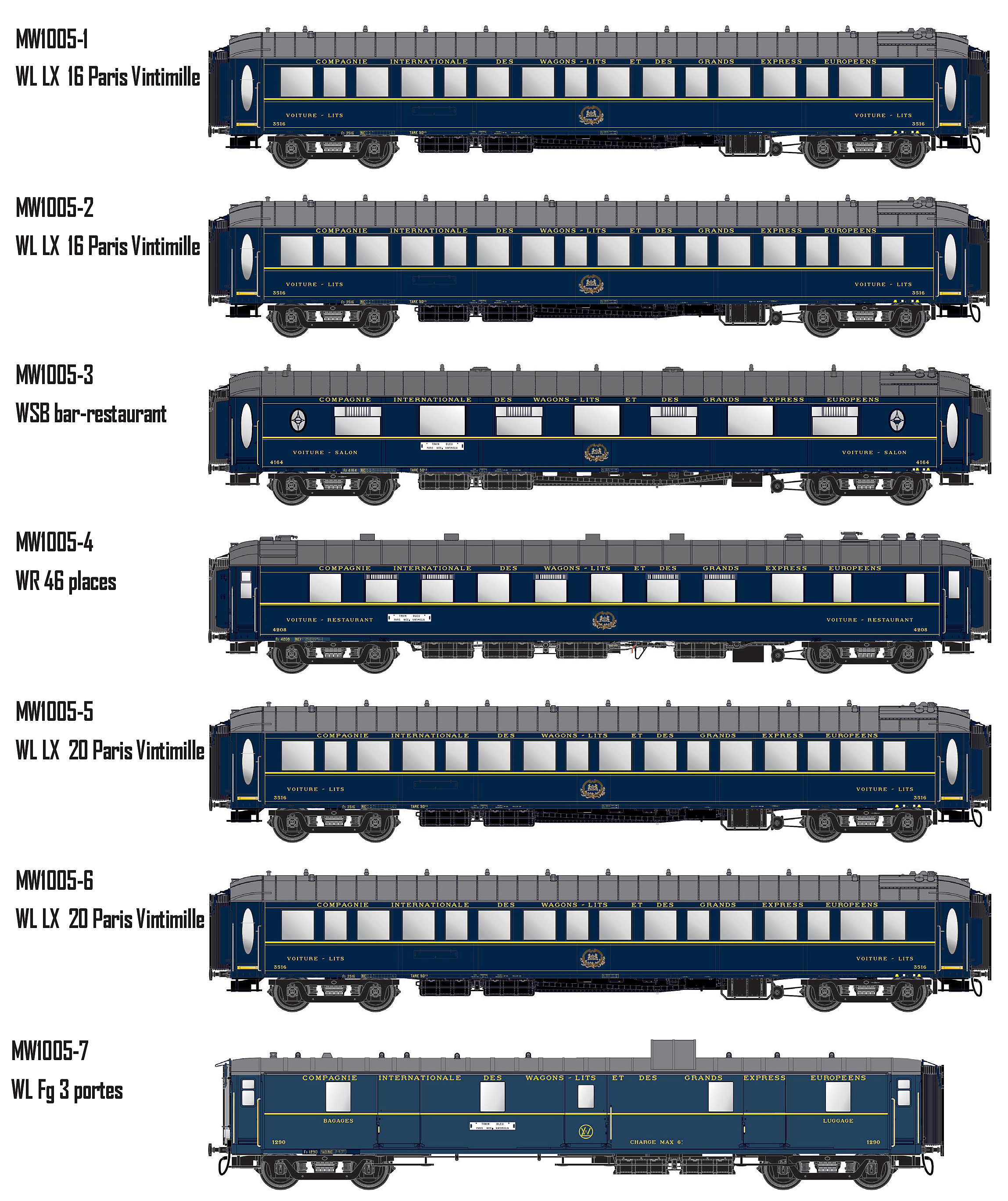 Reisezugwagen-Set 7-teilig der CIWL "Train Bleu", für die Epoche 2 (1957).