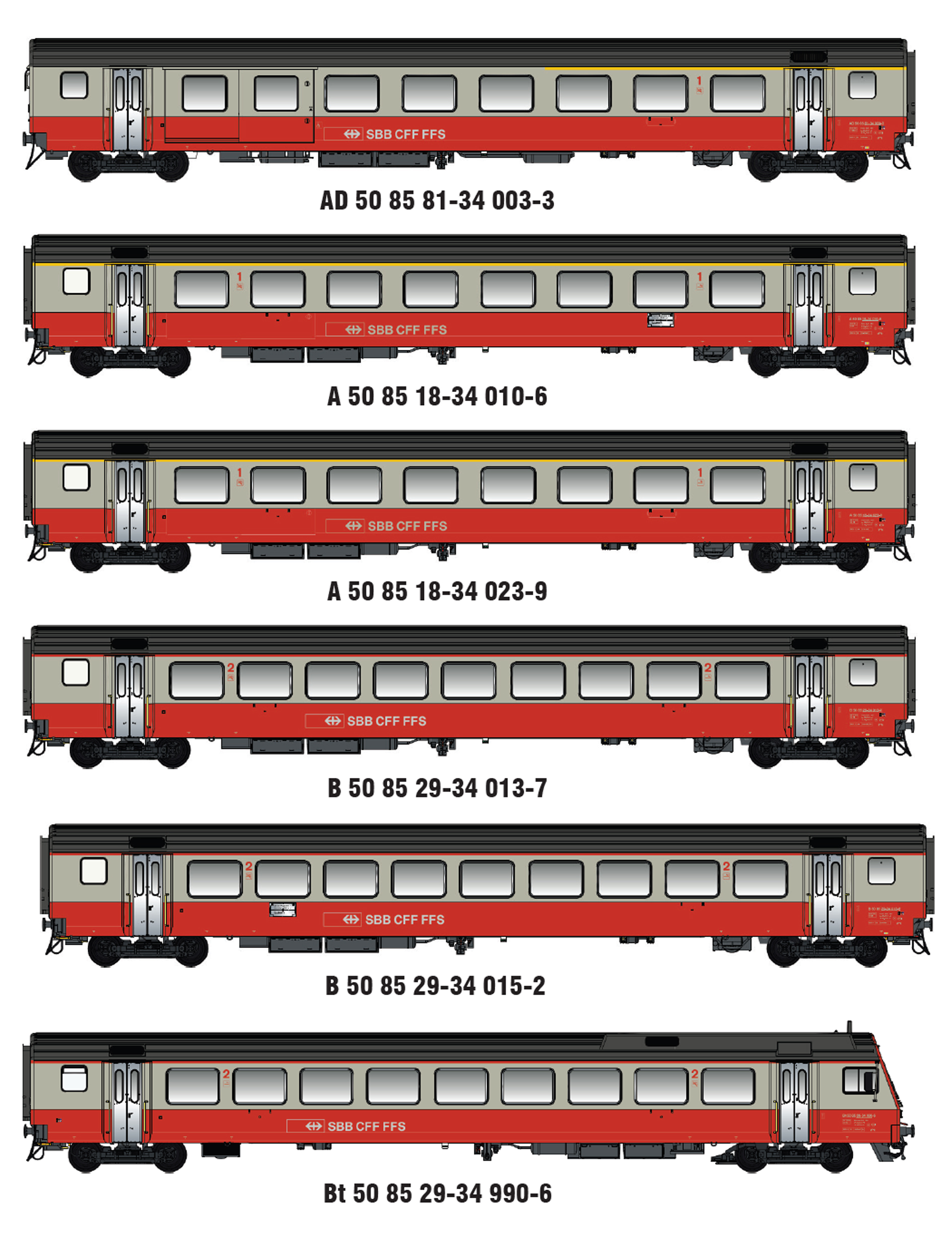 6-teiliges Personenwagen-Set EW III mit Steuerwagen Airport Express, Zürich Flughafen - Luzern der SBB, für die Epoche 4.