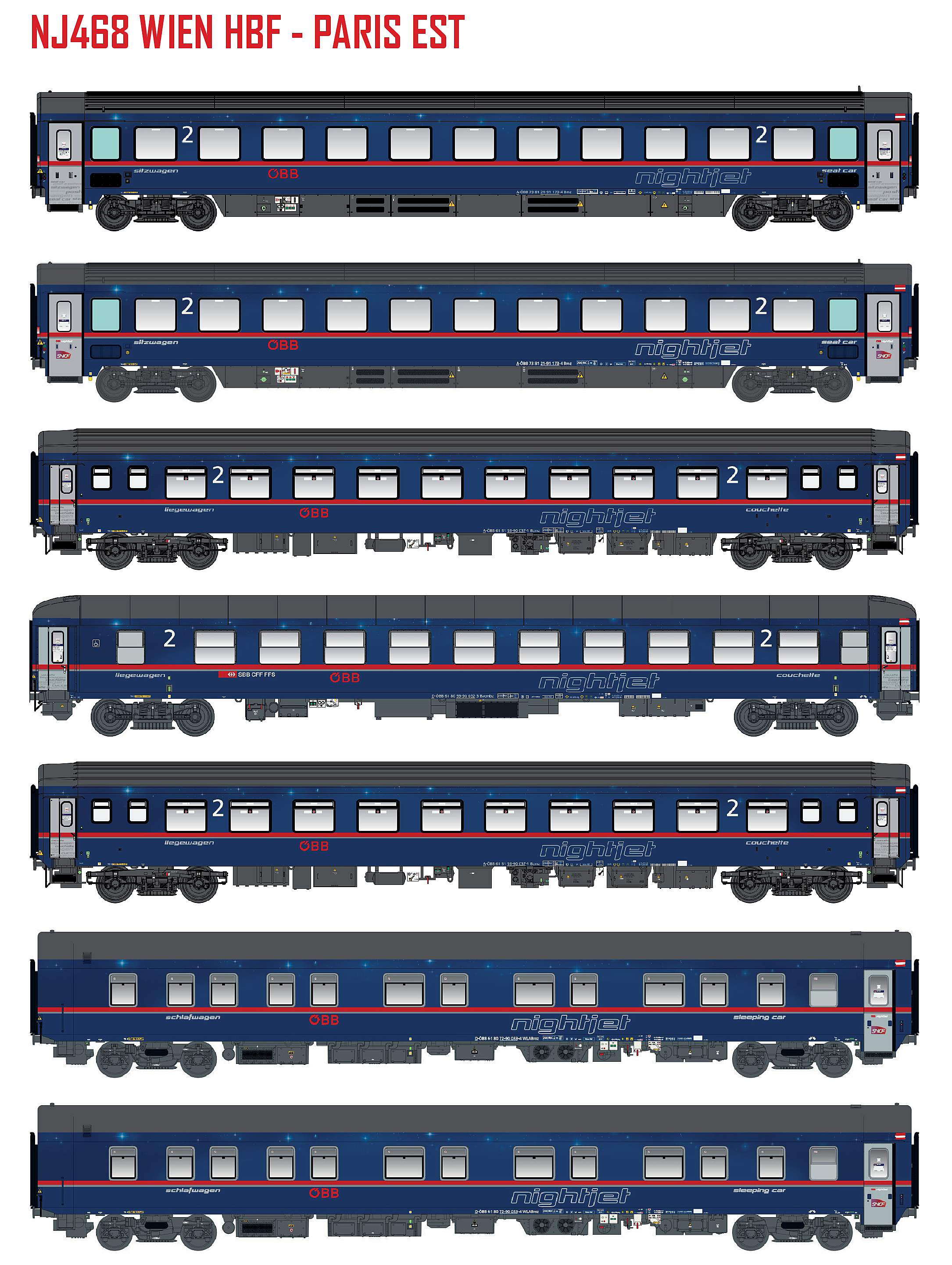 AC 7-teiliges ÖBB Nightjet Nachtzugwagen-Set NJ468 Wien Hbf - Paris Est, für die Epoche 6.