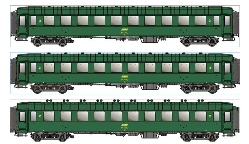 3-teiliges Personenwagen-Set der Bauart B10 der SNCF für die Epoche 4a.