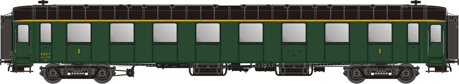 1. Klasse OCEM Personenwagen der Bauart A8 der SNCF, genietete Seitenwände, grün 306, schwarzes Dach und Fahrwerk. für die Epoche 3c (1956-68).