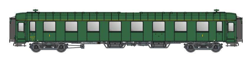 1. Klasse OCEM Personenwagen der Bauart A8 der SNCF, genietete Seitenwände, grün 301, graues Fahrwerk. für die Epoche 3d (1960-68).