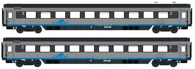 2-teiliges Reisezugwagen-Set der SBB in Cisalpino Lackierung, für die Epoche 5.