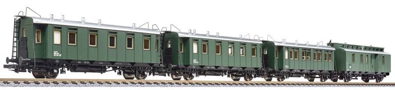 4-teiliges Set, 2-achsige Personenwagen der ÖBB, bestehend aus einem Wagen der 2. Klasse (Serie Be), zwei Wagen der