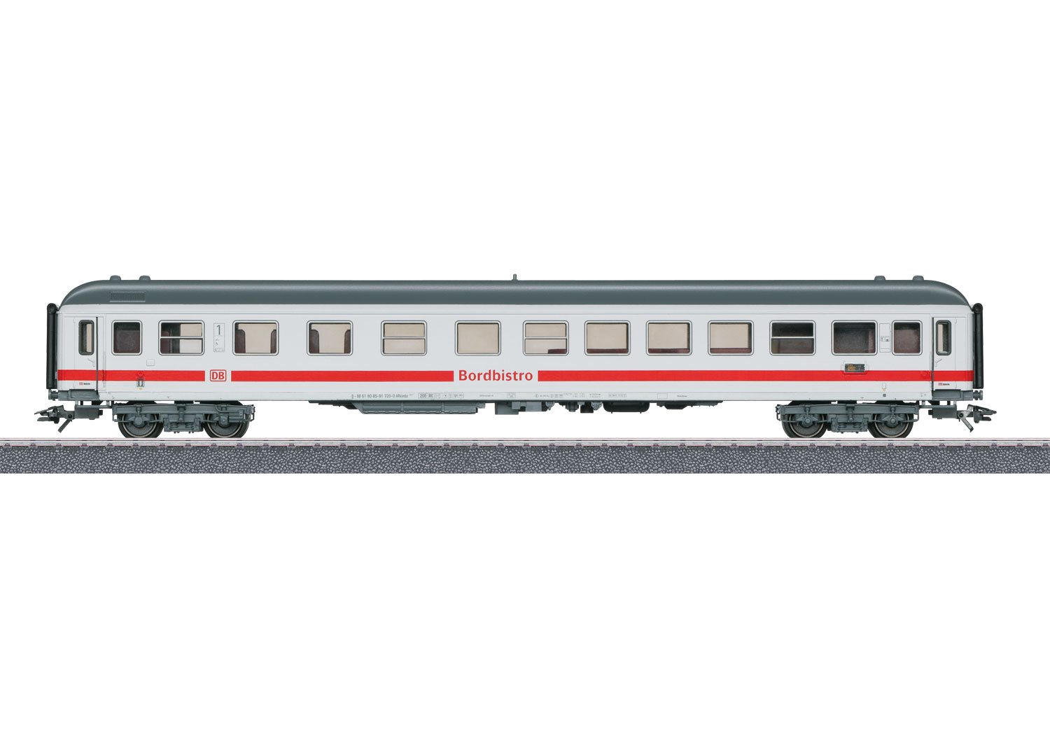 Märklin Start up. Vorbild: Intercity-Bistrowagen ARkimbz 266.7 der Deutschen Bahn AG (DB AG), 1. Klasse. Modell: Vorbereitet zur stromführenden Wagenverbindung wahlweise mit steckbaren Kurzkupplungsdeichseln 7319 oder trennbaren Kurzkupplungen 72020/72021. Verstellbare Puffer. Länge über Puffer 27 cm. Gleichstromradsatz E700580.