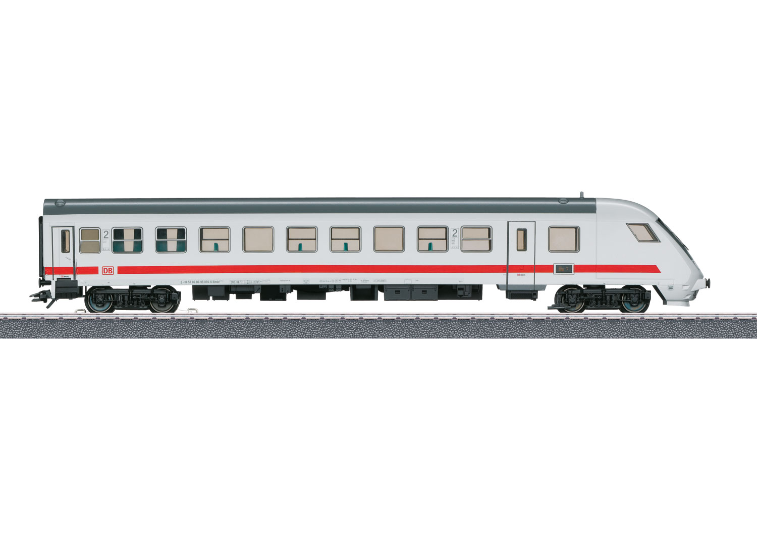 Märklin Start up. Vorbild: Intercity-Steuerwagen Bimdzf 271.0 der Deutschen Bahn AG (DB AG), 2. Klasse mit Führerstand für Wendezugbetrieb. Modell: Führerstand mit Inneneinrichtung. Detaillierte Pufferbohle. Angesetzter Frontspoiler. Vorbereitet zur stromführenden Wagenverbindung entweder mit steckbaren Kurzkupplungsdeichseln 7319 oder trennbaren Kurzkupplungen 72020/72021. Länge über Puffer 27,5 cm. Bei schiebender Lokomotive (Steuerwagen voraus) leuchtet am Steuerwagen ein weißes Dreilicht-Spitzensignal. Bei ziehender Lokomotive (Lok voraus) leuchten am Steuerwagen zwei rote Schlusslichter.