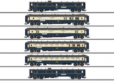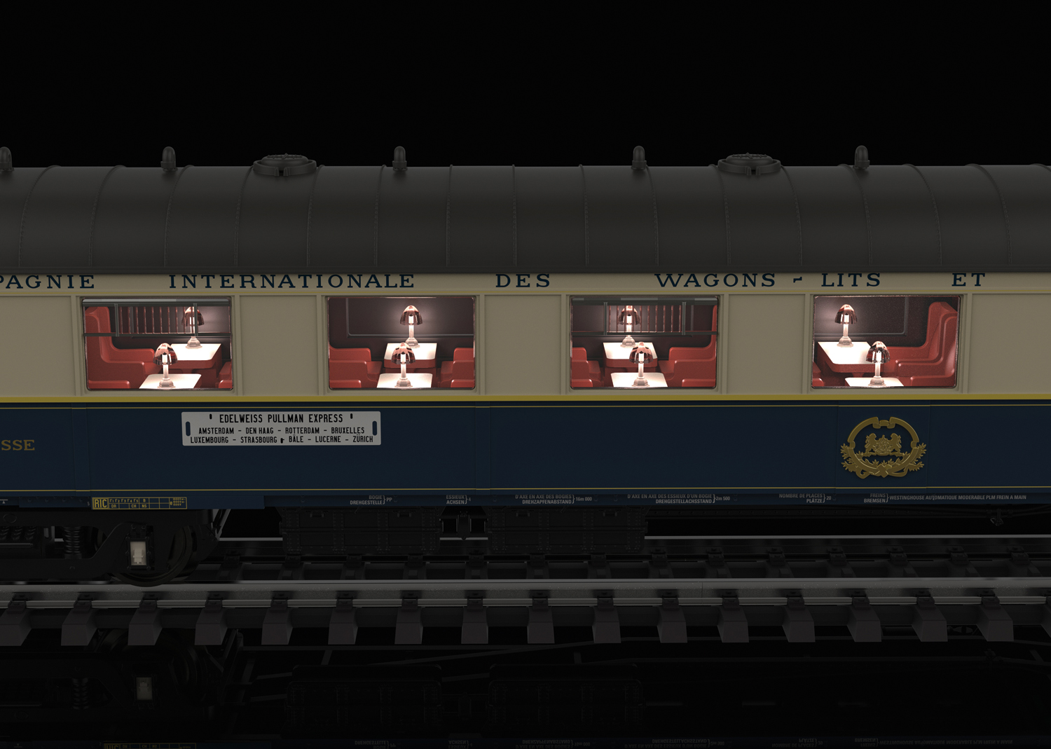 Modell: Alle Wagen mit serienmäßig eingebauter LED-Innenbeleuchtung und serienmäßig eingebauten trennbaren, stromführenden Kurzkupplungen. Salonwagen mit beleuchteten Tischlampen. Ein Gepäckwagen mit Zugschlussbeleuchtung. In jedem Wagen ist ein Pufferkondensator zur Überbrückung von kurzfristigen stromlosen Stellen eingebaut. Die Innenbeleuchtung funktioniert im Verbund mit dem Gepäckwagen mit Schlusslicht. Alle Wagen in unterschiedlicher Ausführung und mit vielen angesetzten, sehr detaillierten Details. Angesetzte Griffstangen aus Metall. Die Inneneinrichtung der Salonwagen ist individuell und mehrfarbig gestaltet. Pufferhöhe nach NEM. Für jeden Wagen sind jeweils vier nachgebildete Hauptluftleitungen beiliegend. Faltenbalg lang und kurz beiliegend. Schleifer zur Stromaufnahme an einem Gepäckwagen. Befahrbarer Mindestradius 360 mm. Länge über Puffer Gepäckwagen ca. 23,9 cm. Länge über Puffer Salonwagen ca. 26,9 cm. Gesamtsänge über Puffer ca. 156,5 cm. Vorbild: Sechs unterschiedliche Pullman-Wagen in der Ausführung der Compagnie Internationale des Wagons-Lits et des Grands Express Européens (CIWL) als EDELWEISS PULLMAN EXPRESS. Zwei Gepäckwagen Typ DD3, ein Pullman-Wagen mit Küche VPC Typ Côte d´Azur, ein Pullman-Wagen ohne Küche VP Typ Côte d´Azur, ein Pullman-Wagen mit Küche VPC Typ Étoile du Nord und ein Pullman-Wagen ohne Küche VP Typ Étoile du Nord. Zuglauf Amsterdam - Den Haag - Rotterdam – Bruxelles Luxembourg - Strasbourg – Bâle - Lucerne– Zürich. Betriebszustand 1937. Compagnie Internationale des Wagons-Lits CIWL – ein glanzvoller Name aus der Blütezeit der Eisenbahn. Diese schon in der zweite Hälfte des 19. Jahrhunderts vom belgischen Entrepreneur Georges Nagelmackers gegründete Firma wurde schnell zum Inbegriff des luxuriösen Reisens. Kurz vor dem Ersten Weltkrieg dampften fahrplanmäßig zahlreiche Luxuszüge der CIWL durch ganz Europa. Sie hatten klangvolle Namen wie Orient-Express, Calais-Mediterranée-Express oder Sud-Express. Es waren meistens Schlafwagenzüge, die luxuriöse und mit allem Komfort ausgestattete Schlafabteile boten.In den Goldenen Zwanzigern erholte sich der Markt für erstklassiges Reisen sehr schnell und ab 1925 führte die CIWL die ersten Luxuszüge für den Tagesverkehr ein, die als Pullman-Express von Anbeginn für Furore sorgten. Für diese Zugläufe beschaffte die CIWL neue, äußerst luxuriöse Großraumwagen, die teilweise mit Küche ausgestattet waren. Je ein Wagen mit und ohne Küche bildeten eine äCouplage“, es gab auch Züge mit einer äTriplage“ (zwei Wagen 2. Klasse ohne Küche und ein Wagen 1. Klasse mit Küche). Das Essen wurde am Platz serviert, exklusives Porzellan und Silberbesteck trugen zum besonderen Ambiente bei. Spezielle Speisewagen gab es allerdings nicht. Die neuen Pullmans glänzten nicht nur mit exzellenten inneren Werten. Auch ihr Äußeres strahlte eine eindrucksvolle Eleganz aus. Seine Route Amsterdam – Brüssel – Straßburg – Basel – Zürich/Luzern war nicht weniger attraktiv, als Zugloks kamen meist die modernsten und stärksten Dampfrösser jener Zeit zum Einsatz, wie beispielsweise die legendäre 241 A der Französischen Ostbahn (EST).Obwohl der Laufweg des EDELWEISS PULLMAN EXPRESS bis Basel 31 Kilometer länger als der des Rheingold-Zuges war und er zwischen Namur und Luxemburg sowie zwischen Metz und Straßburg die nördlichen Ausläufer der Vogesen überwinden musste, war der EDELWEISS mit einer Fahrzeit von 10 Stunden und 8 Minuten fast gleich schnell (Rheingold 9 Stunden 46 Minuten). Eine Durchschnittsgeschwindigkeit von 80 Kilometern pro Stunde erreichten damals nicht allzu viele dampfgeführte Züge.In den 1930er-Jahren gehörte der EDELWEISS PULLMAN EXPRESS zu den erfolgreichsten CIWL-Zügen. Der Ausbruch des Zweiten Weltkriegs beendete dann jäh die Epoche der glänzenden Luxuszüge – und somit auch des EDELWEISS.Nach dem Krieg wurde der Zug wieder eingeführt und in den ersten Jahren fuhren sogar noch Pullman-Wagen mit. 1957 erlebte der EDELWEISS dann eine Auferstehung als Luxuszug. Er wurde ins neue europäische TEE-Netz aufgenommen und mit den nagelneuen, niederländisch-schweizerischen 1.-Klasse-Triebwagen der Gattung RAm gefahren, die ebenfalls Vorbild verschiedener gesuchter Märklin-Modelle waren. Aber das ist eine andere Geschichte. Compagnie Internationale des Wagons-Lits et des Grands Express Européens (CIWL) ist eine eingetragene Handelsmarke der Wagons-Lits Diffusion (WLD), Paris, Frankreich. Jedes Recht auf Vervielfältigung wird vorbehalten. © Wagons-Lits Diffusion - France.