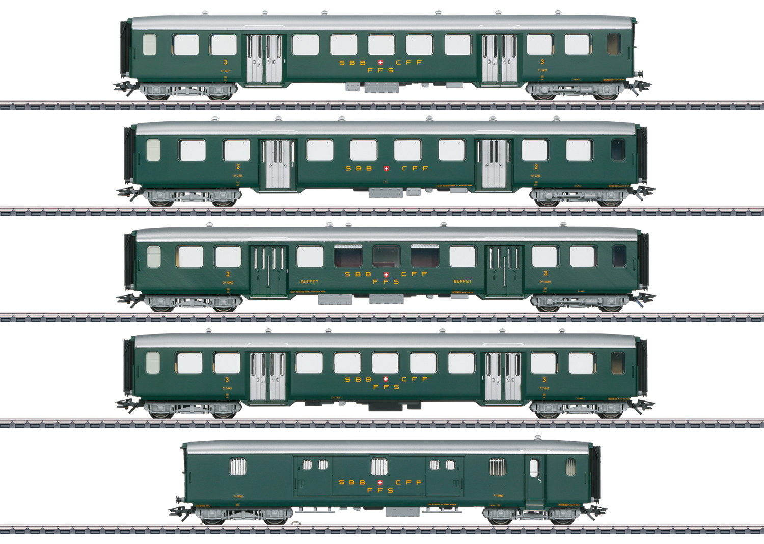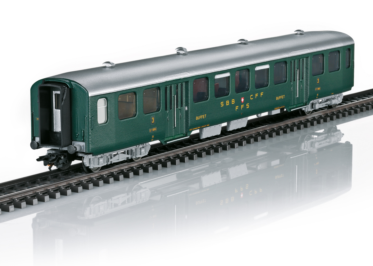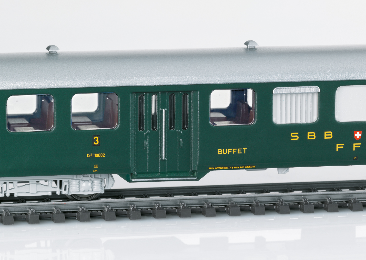 Leichtstahlwagen-Set zur Ae 3/6 I - Modell: Befahrbarer Mindestradius 360 mm. Alle Wagen mit serienmäßig eingebauter Innenbeleuchtung mit warmweißen Leuchtdioden (LED). Leichtstahl-Gepäckwagen serienmäßig mit Schleifer ausgestattet. Über die serienmäßig eingebauten stromführenden Kurzkupplungsköpfe kann der ganze Wagenverband mit Strom versorgt werden. Dazu ist eine fest definierte Fahrzeugreihenfolge vorgegeben. Lange Faltenbälge zum Auswechseln gegen die an den Enden des Wagen-Verbandes montierten kurzen Faltenbälge liegen bei. Gesamtlänge über Puffer 126 cm. Vorbild: 5 verschiedene Leichtstahlwagen unterschiedlicher Bauarten, in der Ausführung der Schweizerischen Bundesbahnen (SBB). 2 Leichtstahlwagen C4, 3. Klasse. 1 Leichtstahlwagen B4, 2. Klasse. 1 Leichtstahlwagen Cr4, 3. Klasse mit Buffet-Bereich. 1 Leichtstahl-Gepäckwagen F4. Für den Einsatz in Leichtschnellzügen im Flachland auf der Strecke Genf-Bern-Zürich. Alle Wagen in tannengrüner Grundfarbgebung. Betriebszustand um 1950. Die passende Elektrolokomotive Ae 3/6 I finden Sie im Märklin H0-Sortiment unter der Artikelnummer 39360. Dieses Leichtstahlagen-Set finden Sie in Gleichstromausführung im Trix H0-Sortiment unter der Artikelnummer 23134. Formvariante des Buffet-WagensAlle Wagen serienmäßig ausgestattet mit LED-InnenbeleuchtungStromführende Kurzkupplungsköpfe zwischen den einzelnen Wagen