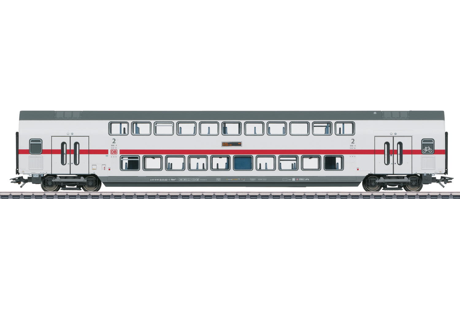 IC2 Doppelstock-Mittelwagen DBpza 682.2, 2. Klasse - Modell: Befahrbarer Mindestradius 360 mm. Mit Hoch-Einstieg über den Drehgestellen. Serienmäßig mit eingebauter LED-Innenbeleuchtung auf beiden Ebenen und stromführenden, trennbaren Kurzkupplungen. Beleuchtete längsseitige Zugzielanzeigen. Innenbeleuchtung funktioniert nur im Verbund mit dem Doppelstock-Steuerwagen und kann über einen Decoder im Steuerwagen digital ein- und ausgeschaltet werden. Dazu ist eine definierte Fahrzeugreihenfolge vorgegeben. Stirnseitig rot transparente Schlusslicht-Einsätze an den Wagenenden. Vorbildgerechte Drehgestelle der Bauart Görlitz, mit angesetzten Klapptrittstufen. Länge über Puffer 28,6 cm. Vorbild: IC2 Doppelstock-Mittelwagen DBpza 682.2, 2. Klasse, der Deutschen Bahn AG (DB AG) für den Fernverkehr. Lichtgraue Fernverkehrs-Farbgebung mit verkehrsrotem Zierstreifen, im aktuellen IC-Design. Zuglauf: IC 2045 von Köln nach Dresden Hbf. Wagen-Ordnungsnummer 4. Betriebszustand 2020. Die passende Elektrolokomotive der Baureihe 146.5 finden Sie ebenfalls im Märklin H0-Sortiment unter der Artikelnummer 37449, zur Bildung einer vorbildgerechten 6-teiligen Zugeinheit mit den Doppelstockwagen 43486, 43487, 43488, 43489 und 43490.Ein Befahren von gebogenen Rampenstücken ist gegebenenfalls nur nach entsprechender Modifikation dieser Auffahrten möglich. Dieses Modell finden Sie in Gleichstromausführung im Trix H0-Sortiment unter der Artikelnummer 23254. Neuer vorbildgerechter Zuglauf: IC 2045 von Köln nach Dresden Hbf.Wagen-Ordnungsnummer 4.Serienmäßig mit LED-Innenbeleuchtung.Innenbeleuchtung im ganzen Wagenverband über Decoder im Steuerwagen digital schaltbar.