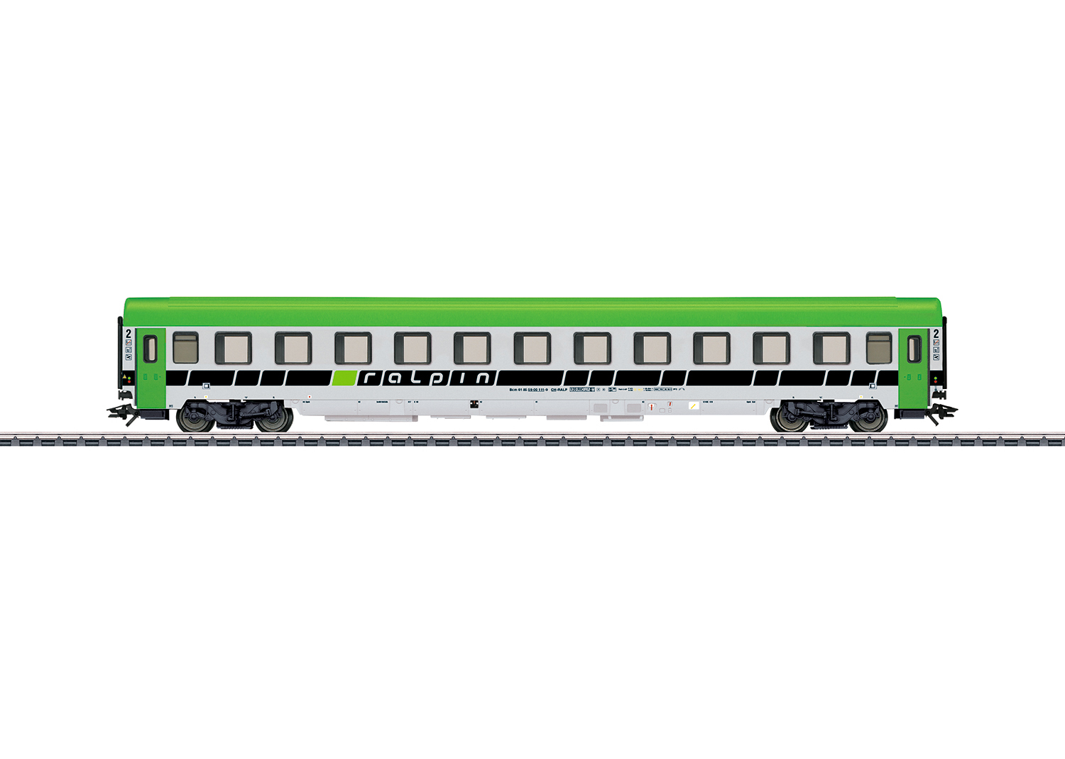 Modell: Auf Basis eines Reisezugwagens 2. Klasse Bauart Bmz. Typspezifisch gestalteter Unterboden. Fiat Drehgestelle Y0270 S mit Schlingerdämpfer und mit Magnetschienenbremse. Vorbereitet für den Einbau der stromführenden Kupplung 7319 oder 72022, Schleifer 73406, der Innenbeleuchtung 73410/73411 und der Zugschlussbeleuchtung 73407. Befahrbarer Mindestradius 360 mm. Länge über Puffer 28,2 cm.