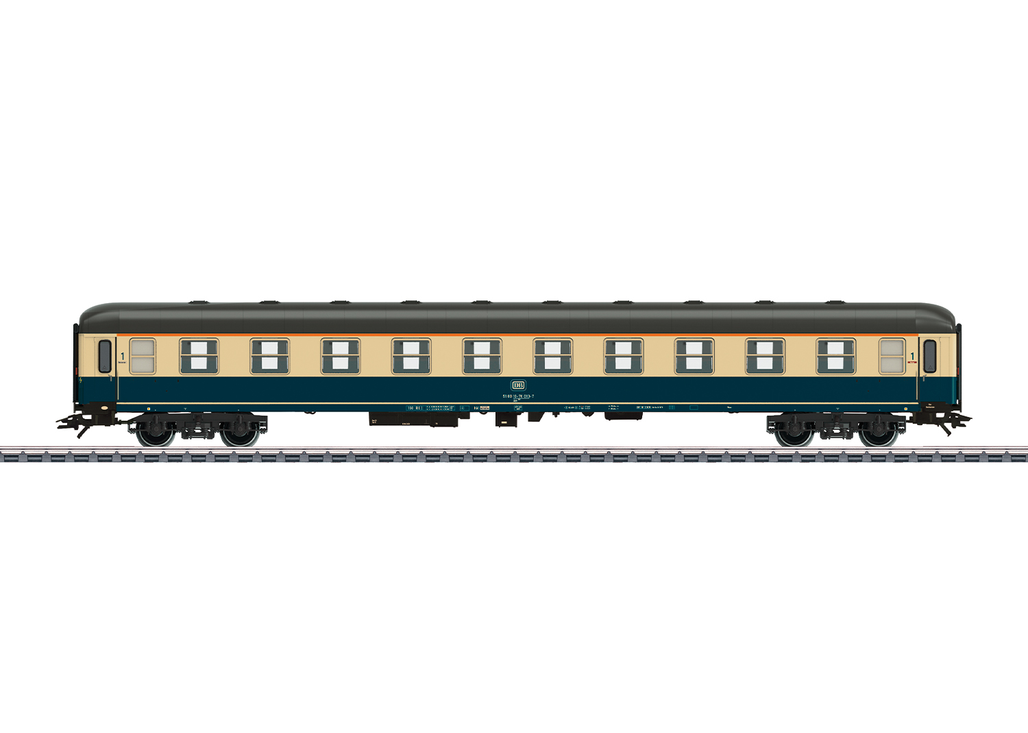 Schnellzugwagen Am 203 - Vorbild: Schnellzugwagen Bauart Am 203, 1. Klasse der Deutschen Bundesbahn (DB). Ozeanblau/Elfenbeinfarbene Grundfarbgebung. Betriebszustand um 1980.Modell: Einstiegstüren mit einteiligen Türfenstern. Einstiege mit festen Trittstufen. Typspezifisch gestalteter Unterboden. Drehgestelle der Bauart Minden-Deutz schwer (Bauart 361) mit Scheibenbremsen und ohne Magnetschienenbremse. Separat angesetzter Generator an einem Drehgestell. Vorbereitet für den Einbau der stromführenden Kupplungen 7319 oder 72022, Schleifer 73406, der Innenbeleuchtung 73410/73411 und der Zugschlussbeleuchtung 73407. Befahrbarer Mindestradius 360 mm. Länge über Puffer 28,2 cm. Gleichstromradsatz E700580.Weitere ergänzende Schnellzugwagen finden Sie im Märklin H0-Sortiment unter den Artikelnummern 43925, 43934 und 43953. Eine passende Elektrolokomotive finden Sie im Märklin H0-Sortiment unter der Artikelnummer 39125.