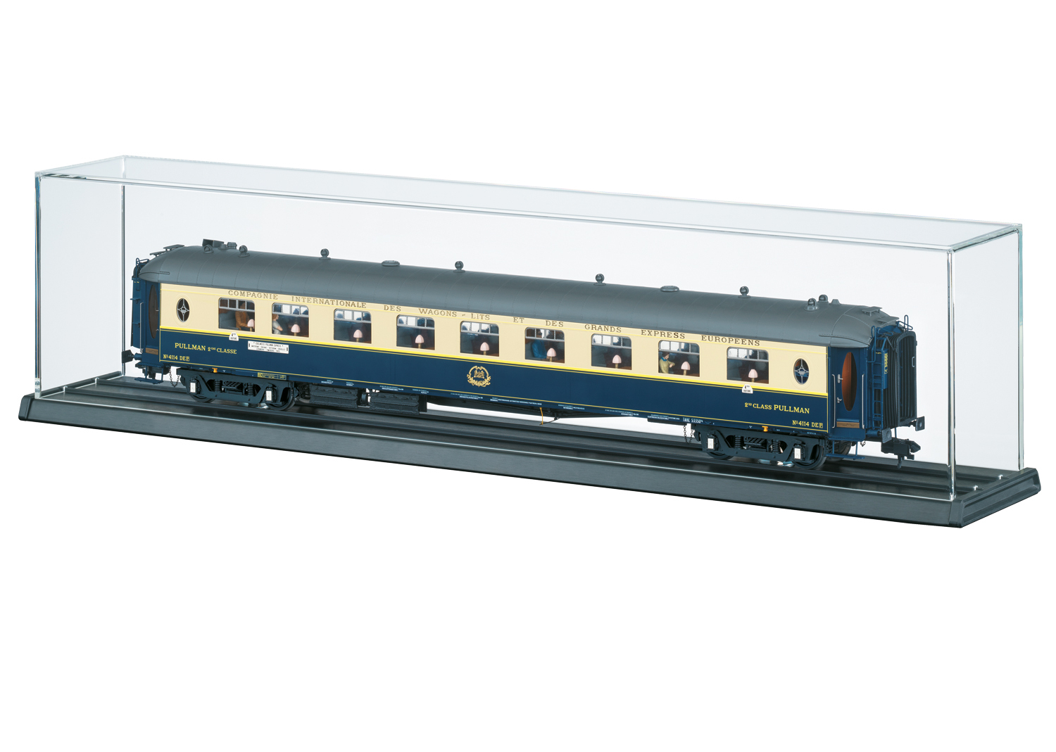Modell: CIWL-Salonwagen ohne Küche. Präsentations-Handarbeitsmodell mit Plexiglas-Schutzhaube/Aluminium Präsentationssockel und eingebauten Metall-Figuren. Der Wagen kann zur Präsentation als auch im Fahrbetrieb verwendet werden. Fahrzeug weitestgehend in Metall umgesetzt. Wagenaufbau und Dach aus Messingblech mit angesetzten Messing-Schleudergussteilen und nur wenigen Teilen aus Kunststoff. Wagenboden aus Aluminium. Metallfiguren in neuer Farbgestaltung ab Werk eingebaut.