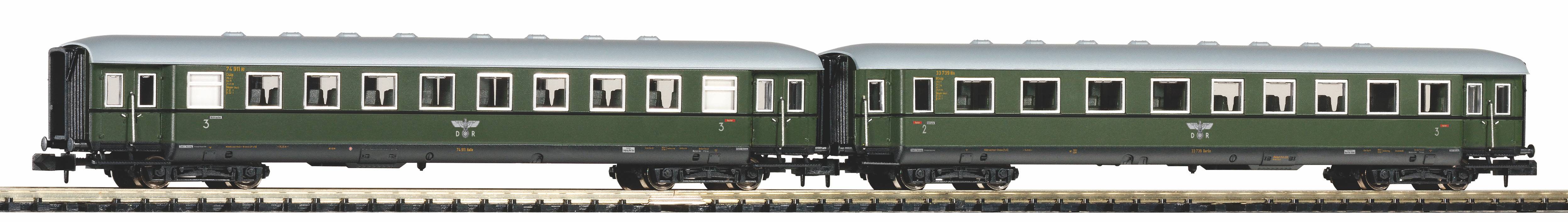 Druckvariante der PIKO Schürzeneilzugwagen als attraktives Wagenset bestehends aus einem Wagen 2./3. Klasse und einem Wagen 3. Klasse zugehörig zur Deutschen Reichsbahngesellschaft der Epoche II