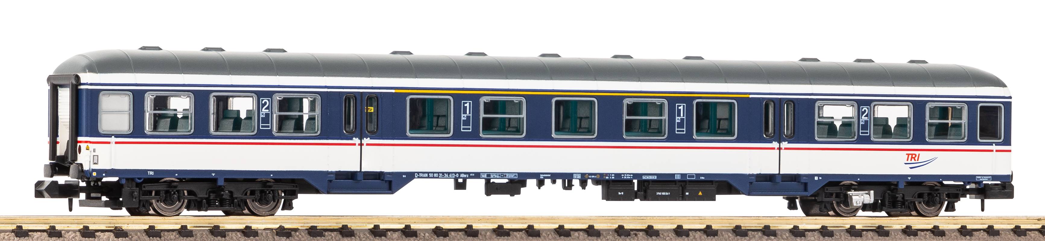 Neuheit 2024: Personenwagen 1./2. Klasse im Design der TRI in Epoche VI. Die TRI Train Rental GmbH ist ein deutsches Eisenbahnverkehrsunternehmen, das sich auf den Erhalt von historischen Fahrzeugen spezialisiert hat. Darüber hinaus hat sich das Unternehmen zu einem Dienstleister für Sonder-, Ersatz- und Notfalldienste entwickelt. Die aufgearbeiteten Fahrzeuge werden für den regulären Personenverkehr zur Verfügung gestellt. Neben der Optik überzeugen das Modell auch durch die hervorragenden Laufeigenschaften und ist für die unkomplizierte Nachrüstung einer Innenbeleuchtung vorbereitet.
