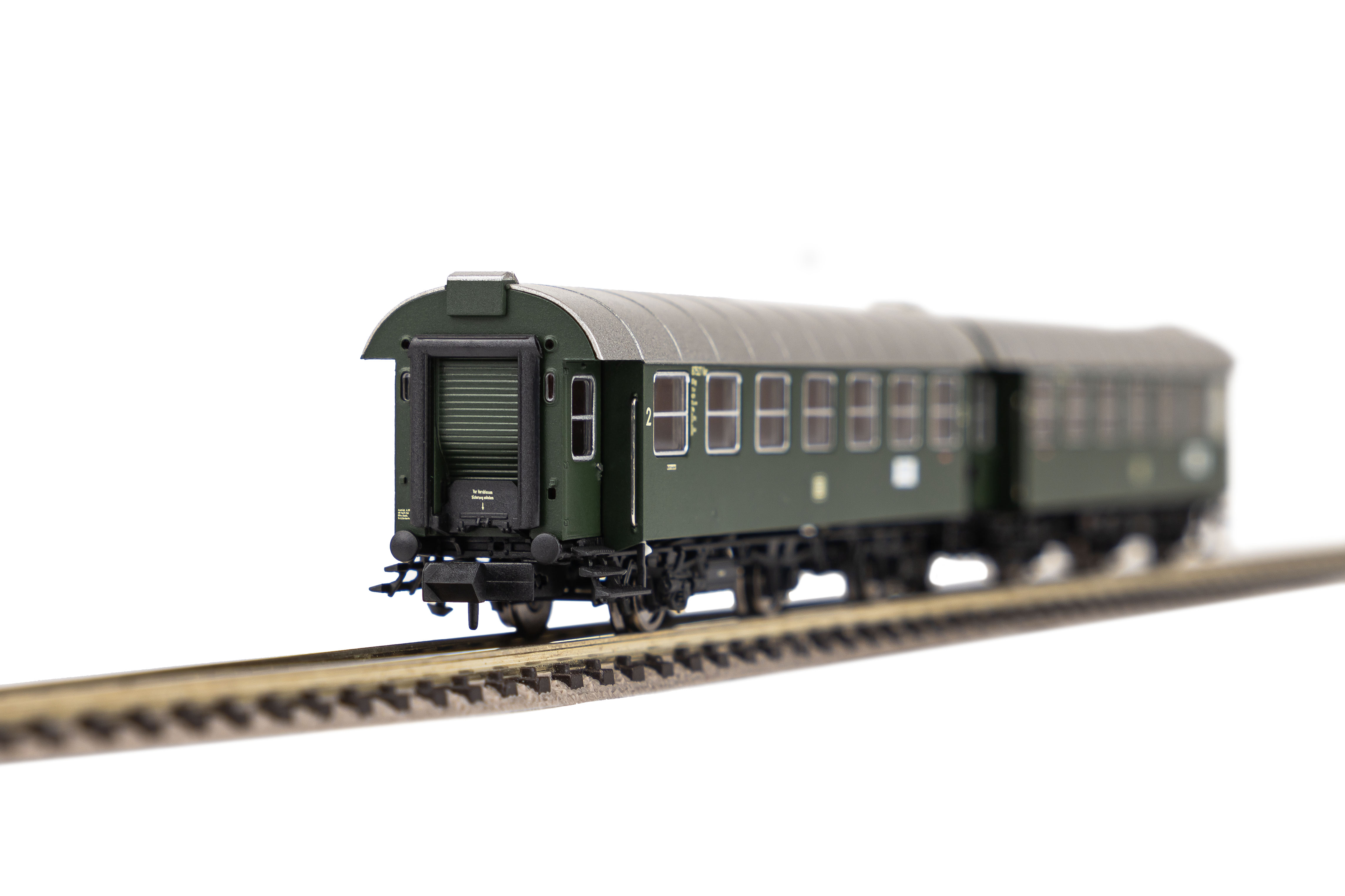 Neuheit 2024: Ab Mitte der 1950er-Jahre entstanden durch Umbau von Länderbahn-Abteilwagen bei der Deutschen Bundesbahn zwei Reisezug-Wagenserien, die als Umbauwagen bezeichnet werden. Anders als beim Vorbild wurde für die PIKO Modelle der dreiachsigen Umbauwagen nicht auf vorhandene Teile zurückgegriffen. Bei den Wagen handelt es sich um vollständige Neukonstruktionen. Die maßstäblichen Fahrzeuge geben das Original bis ins kleinste Detail wieder. Einzeln angesetzte Griffstangen gehören genauso zur zeitgemäßen Konstruktion wie bündig abschließende, glasklare Fenster und eine detaillierte Inneneinrichtung. Die liebevolle Gestaltung setzt sich am Wagenboden fort. Er überzeugt unter anderem durch freistehende Leitungen und ein filigranes Bremsgestänge. Wie das Vorbild erscheinen auch die N Umbauwagen als kurzgekuppelte Pärchen im Handel und verfügen über einen vorbildnahen Abstand zwischen den Wagen. Zusammen mit dem PIKO Lokomotivmodell der Baureihe E 32 (Art.-Nr. 40820) lassen sich vorbildgerechte Zugverbände bilden, die zum absoluten Blickfang auf jeder Anlage werden.