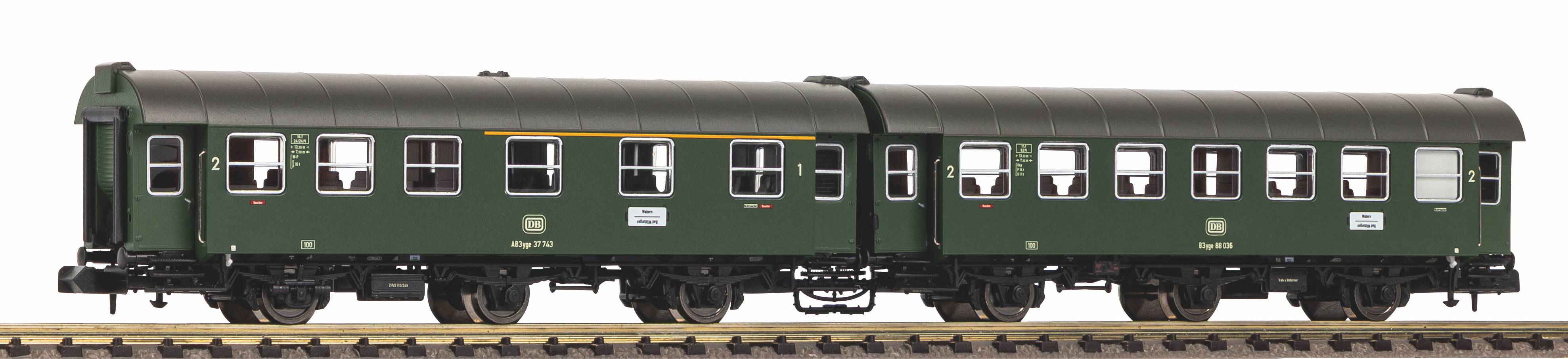 Neuheit 2025: Umbauwagen-Pärchen der DB mit vorbildgerechter Lackierung und Bedruckung der Epoche IV, bestehend aus einem 1. Klasse und einem 2. Klasse Wagen.Ab Mitte der 1950er-Jahre entstanden durch Umbau von Länderbahn-Abteilwagen bei der Deutschen Bundesbahn zwei Reisezug-Wagenserien, die als Umbauwagen bezeichnet werden. Anders als beim Vorbild wurde für die PIKO Modelle der dreiachsigen Umbauwagen nicht auf vorhandene Teile zurückgegriffen. Bei den Wagen handelt es sich um vollständige Neukonstruktionen. Die maßstäblichen Fahrzeuge geben das Original bis ins kleinste Detail wieder. Einzeln angesetzte Griffstangen gehören genauso zur zeitgemäßen Konstruktion wie bündig abschließende, glasklare Fenster und eine detaillierte Inneneinrichtung. Die liebevolle Gestaltung setzt sich am Wagenboden fort. Er überzeugt unter anderem durch freistehende Leitungen und ein filigranes Bremsgestänge. Wie das Vorbild erscheinen auch die N Umbauwagen als kurzgekuppelte Pärchen im Handel und verfügen über einen vorbildnahen Abstand zwischen den Wagen.