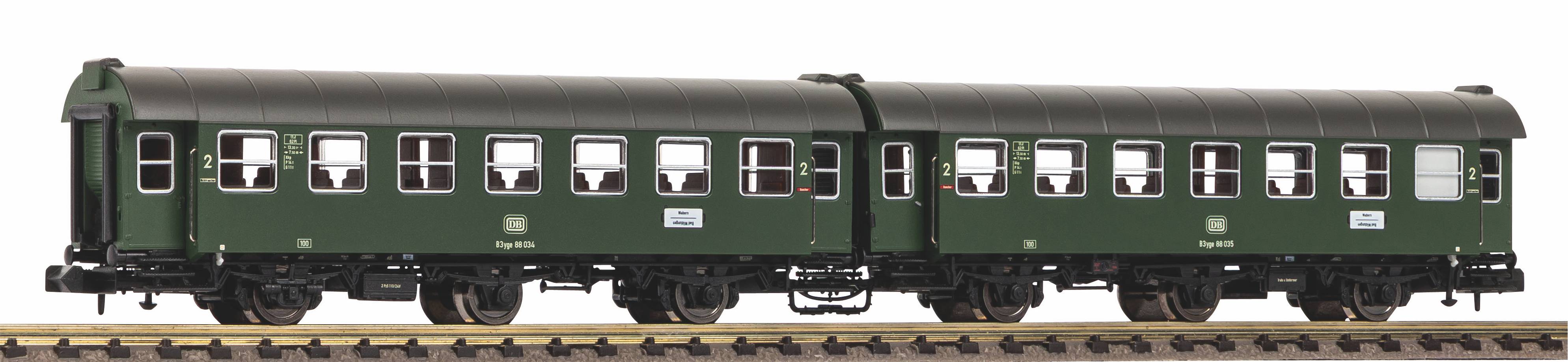 Neuheit 2025: Umbauwagen-Pärchen der DB mit vorbildgerechter Lackierung und Bedruckung der Epoche IV, bestehend aus zwei 2. Klasse Wagen.Ab Mitte der 1950er-Jahre entstanden durch Umbau von Länderbahn-Abteilwagen bei der Deutschen Bundesbahn zwei Reisezug-Wagenserien, die als Umbauwagen bezeichnet werden. Anders als beim Vorbild wurde für die PIKO Modelle der dreiachsigen Umbauwagen nicht auf vorhandene Teile zurückgegriffen. Bei den Wagen handelt es sich um vollständige Neukonstruktionen. Die maßstäblichen Fahrzeuge geben das Original bis ins kleinste Detail wieder. Einzeln angesetzte Griffstangen gehören genauso zur zeitgemäßen Konstruktion wie bündig abschließende, glasklare Fenster und eine detaillierte Inneneinrichtung. Die liebevolle Gestaltung setzt sich am Wagenboden fort. Er überzeugt unter anderem durch freistehende Leitungen und ein filigranes Bremsgestänge. Wie das Vorbild erscheinen auch die N Umbauwagen als kurzgekuppelte Pärchen im Handel und verfügen über einen vorbildnahen Abstand zwischen den Wagen.