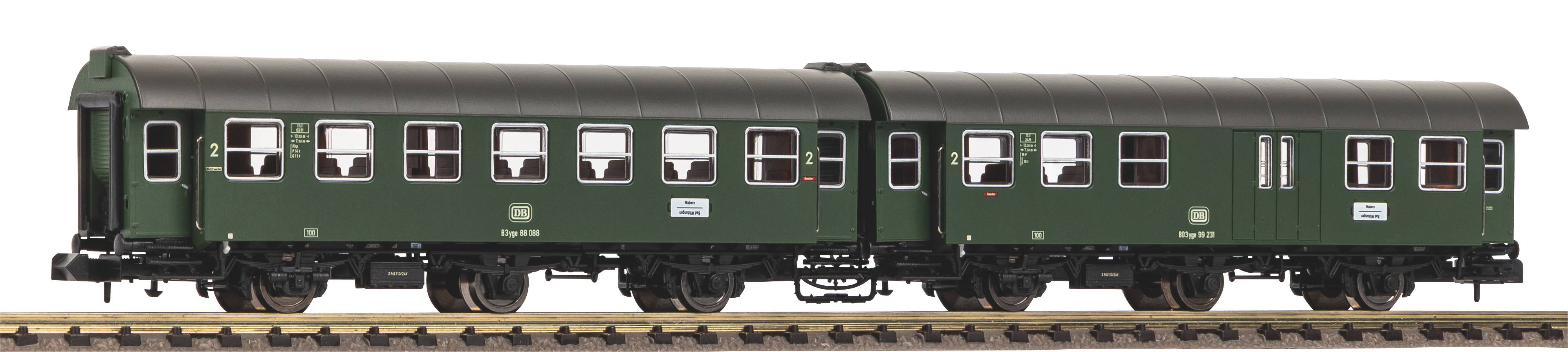 Neuheit 2025: Umbauwagen-Pärchen der DB mit vorbildgerechter Lackierung und Bedruckung der Epoche IV, bestehend aus einem 2. Klasse Wagen und einem 2. Klasse Wagen mit Gepäckabteil.Ab Mitte der 1950er-Jahre entstanden durch Umbau von Länderbahn-Abteilwagen bei der Deutschen Bundesbahn zwei Reisezug-Wagenserien, die als Umbauwagen bezeichnet werden. Anders als beim Vorbild wurde für die PIKO Modelle der dreiachsigen Umbauwagen nicht auf vorhandene Teile zurückgegriffen. Bei den Wagen handelt es sich um vollständige Neukonstruktionen. Die maßstäblichen Fahrzeuge geben das Original bis ins kleinste Detail wieder. Einzeln angesetzte Griffstangen gehören genauso zur zeitgemäßen Konstruktion wie bündig abschließende, glasklare Fenster und eine detaillierte Inneneinrichtung. Die liebevolle Gestaltung setzt sich am Wagenboden fort. Er überzeugt unter anderem durch freistehende Leitungen und ein filigranes Bremsgestänge. Wie das Vorbild erscheinen auch die N Umbauwagen als kurzgekuppelte Pärchen im Handel und verfügen über einen vorbildnahen Abstand zwischen den Wagen.