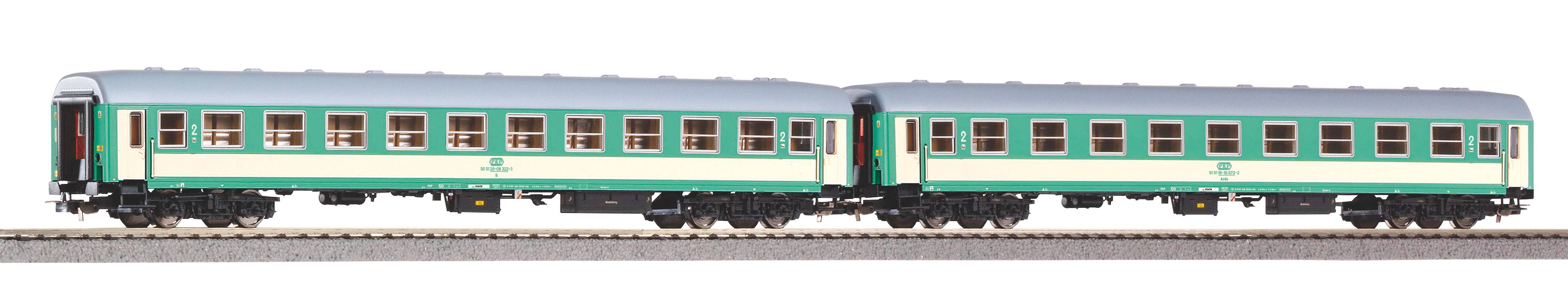 Attraktives Wagenset der PKP bestehend aus zwei Personenwagen vom Typ 111A, für die Epoche 5.