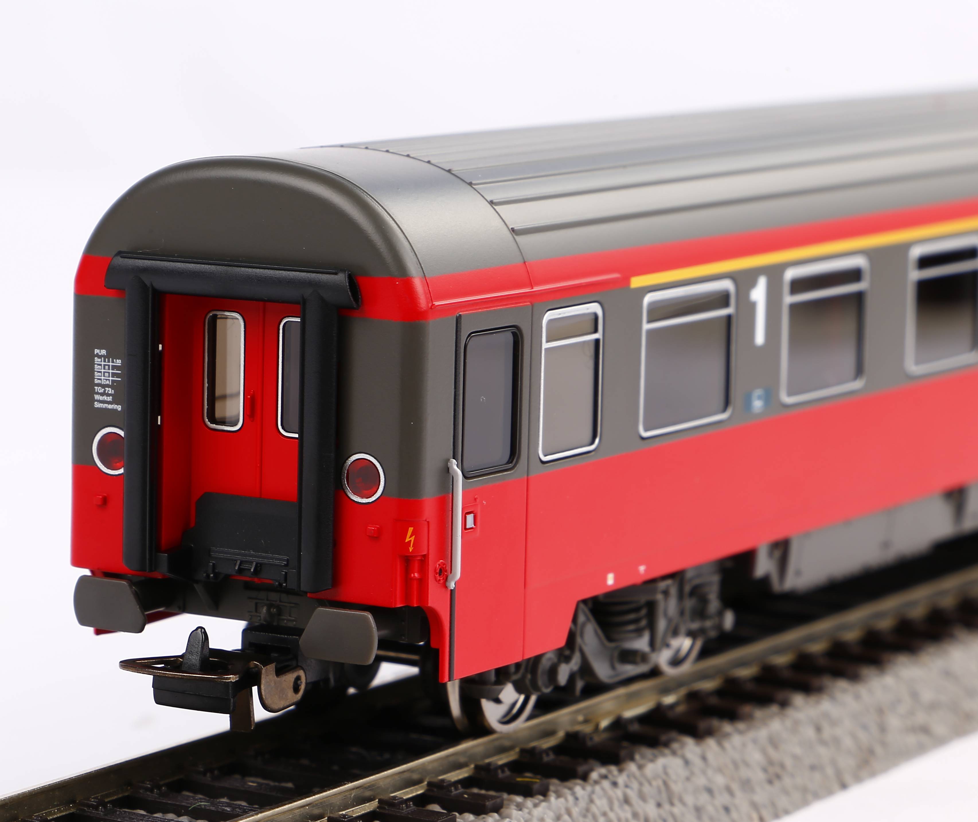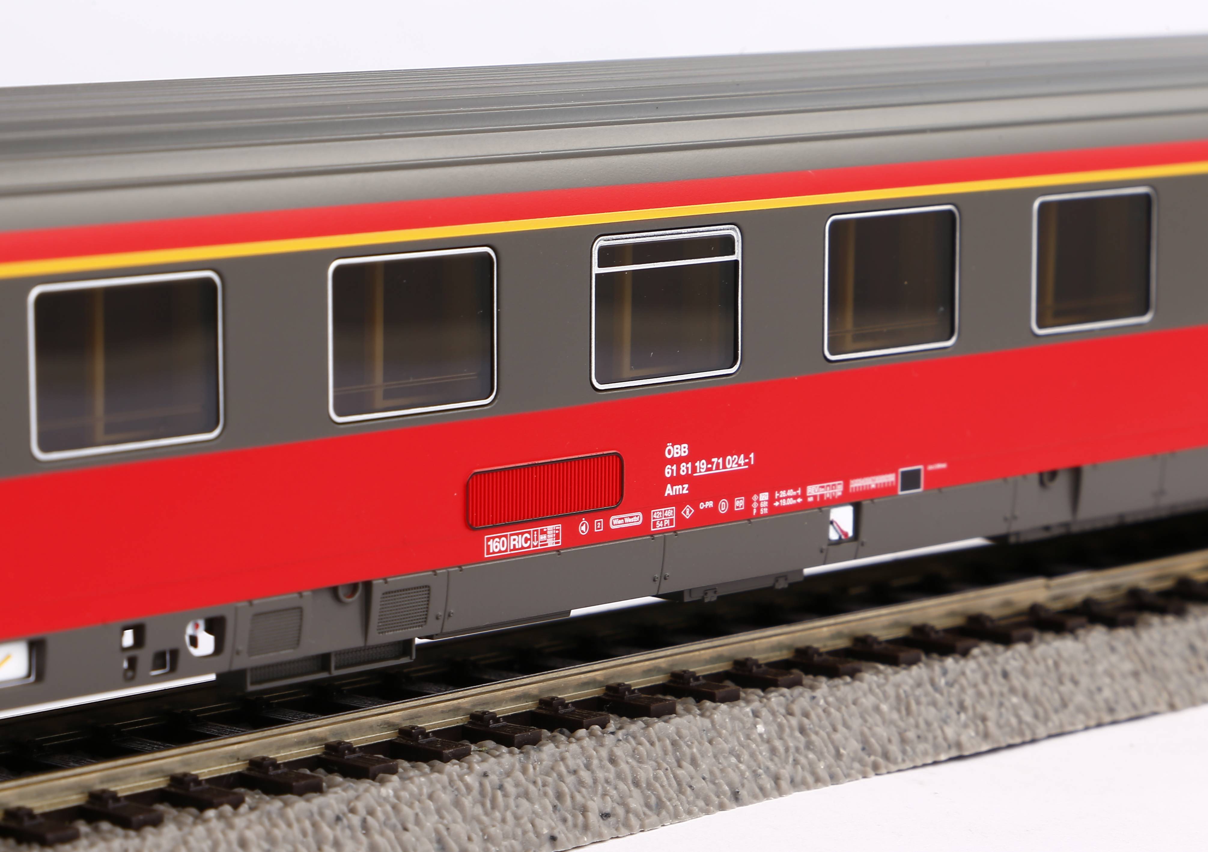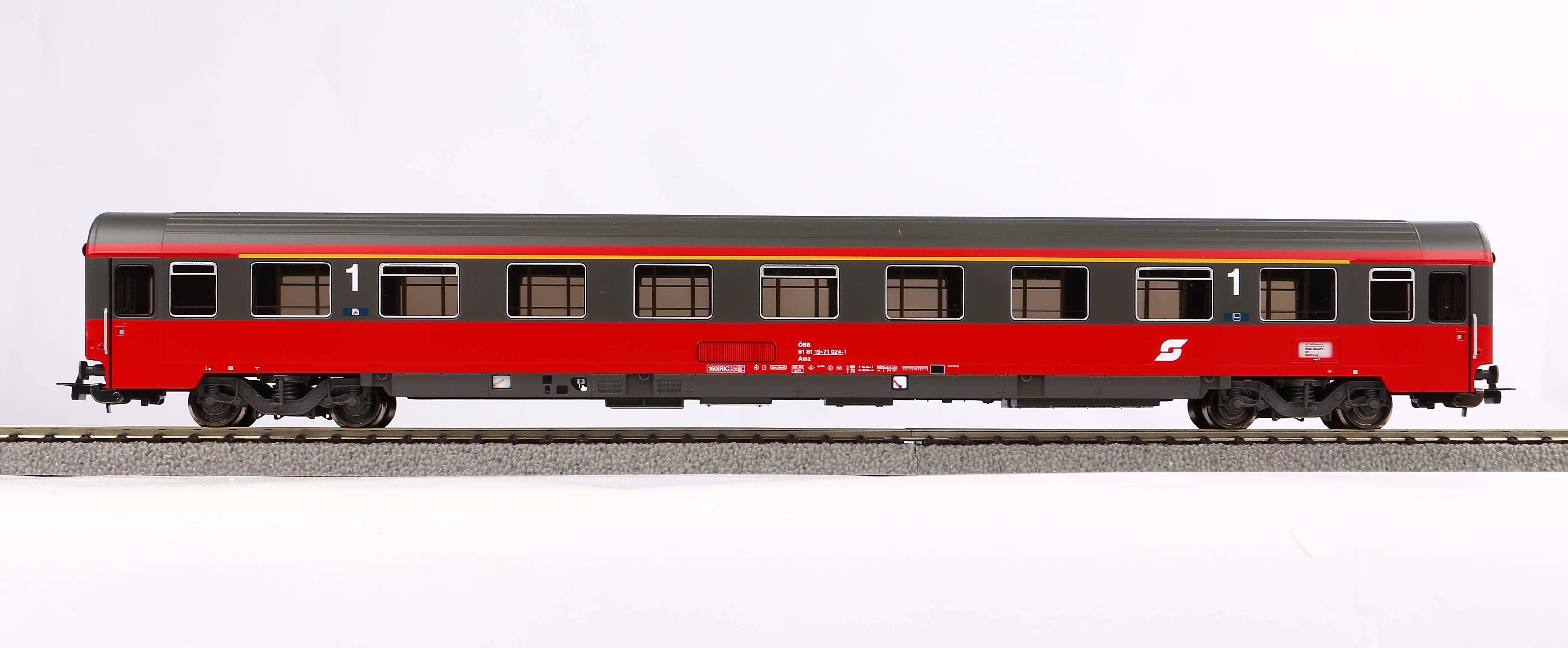 Druckvariante der Schnellzugwagen Eurofima im Design eines 1. Klasse Wagens der ÖBB in der Epoche IV. In den 1970er-Jahren wuchsen Europas Eisenbahnen technisch zusammen, ohne dabei ihren eigenständigen Charakter zu verlieren. Dies manifestierte sich in der gemeinsamen Beschaffung moderner Reisezugwagen. Diese seinerzeit wegweisende Konstruktion bereichert auch das PIKO Sortiment und ergänzt die Wagen des IC '79 um den legendären Avmz 207 sowie die Möglichkeit internationale Fernzüge zu arrangieren. Die Fahrzeuge wurden präzise im Maßstab 1:87 umgesetzt und zeichnen sich durch absolut stimmige Form- und Farbgebung aus. Als Muster zeitgemäßen Formenbaus können die filigranen Drehgestelle betrachtet werden, aber auch die präzisen Gravuren der Dachsicken zeugen hiervon. Für einen abwechslungsreichen Modellbahnbetrieb kann ganz einfach eine individuell für diesen Wagentyp konstruierte LED-Innenbeleuchtung nachgerüstet werden. Die Verbreitung des Vorbilds lässt zahlreiche Varianten verschiedener Bahnverwaltungen zu und repräsentiert so ein europäisches Eisenbahnmodell. Vielleicht wäre es auch bei der großen Bahn wieder Zeit für neue gesamteuropäische Eisenbahnwagen ...