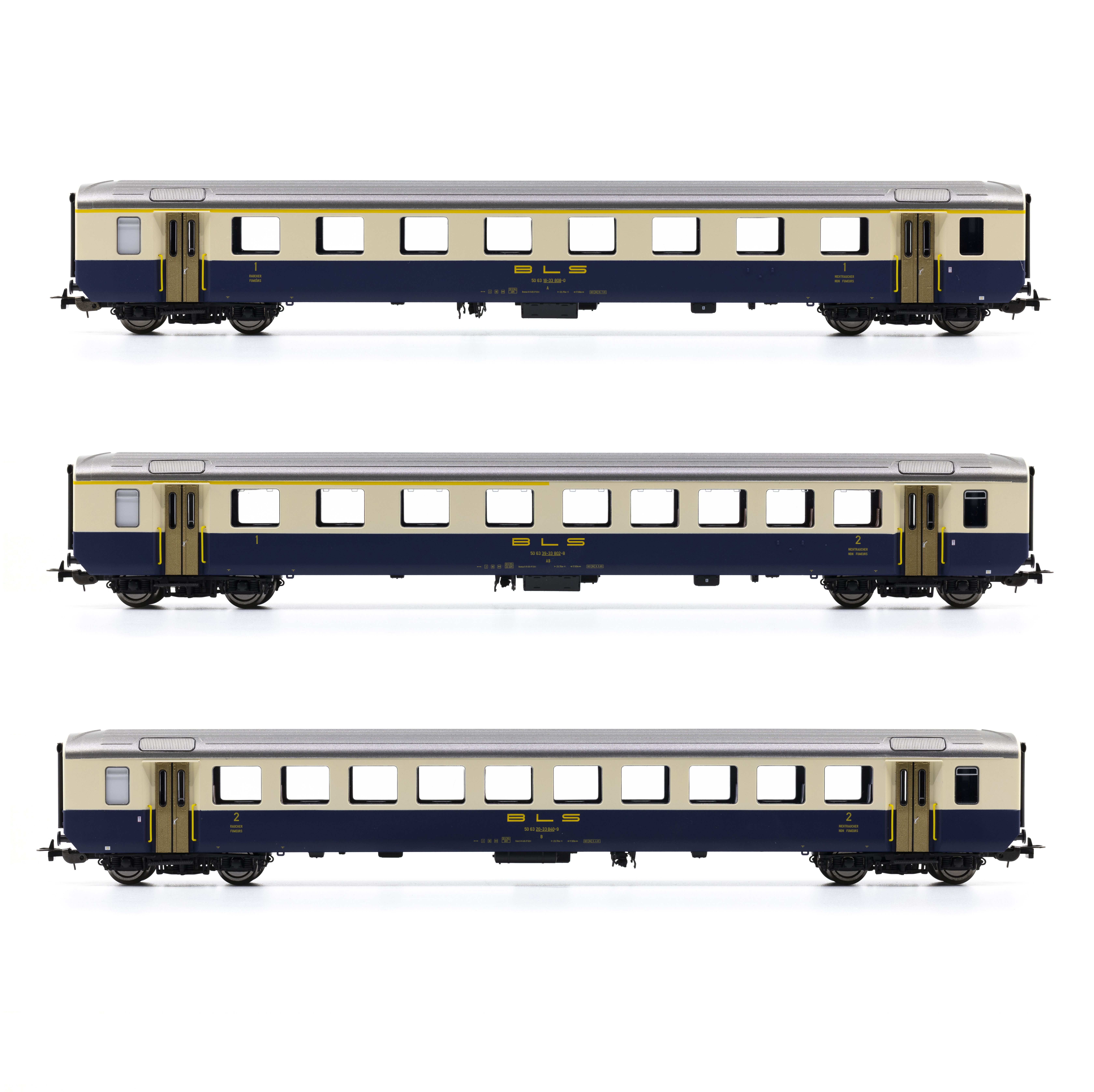 BLS Reisezugwagen-Set 3-teilig EW I A, AB, B mit Mittelschrift und Handgriffen, für die Epoche 4.